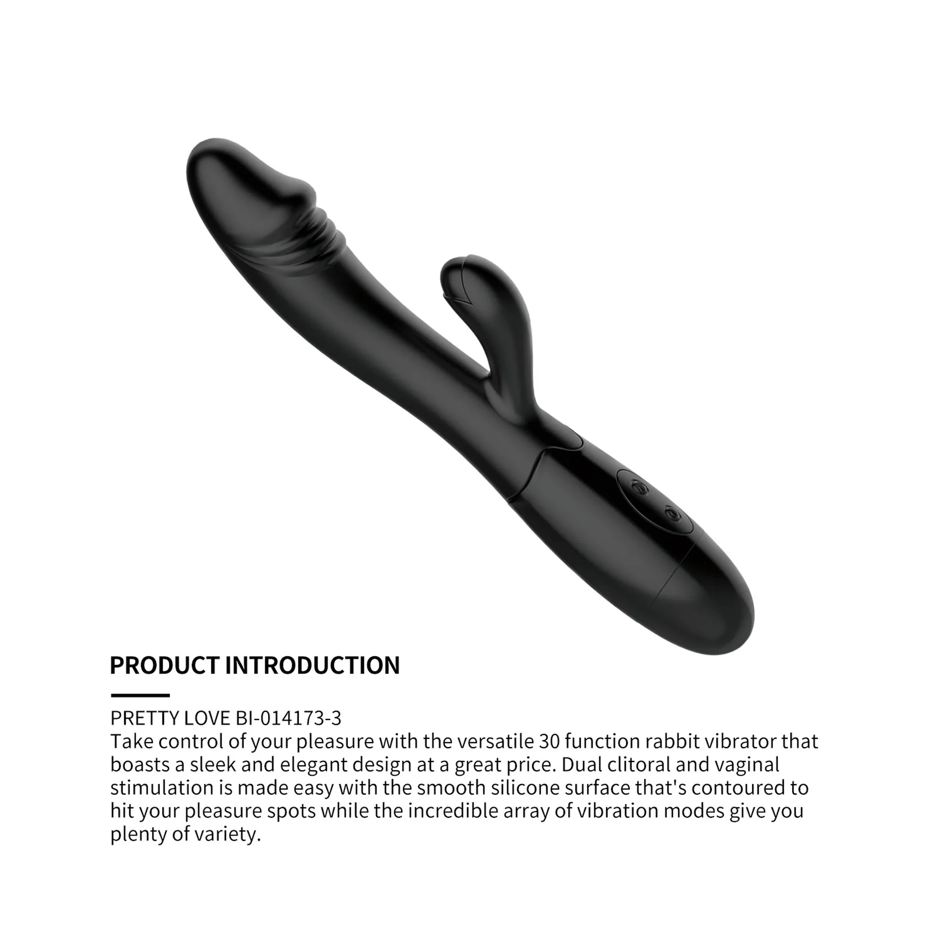 2. Вібратор кролик Pretty Love працює від двох батарейок типу ААА, виготовлений з якісного силікону, має цілих 30 функцій вібрації. Вібратор має дві кнопки – початок і закінчення роботи і кнопка вібрації. Діаметр іграшки 3,2 см, повна довжина іграшки 19,5 см. У іграшки реалістична головка, а стимулятор клітора виглядає як бутон квітки, що не розпустився.