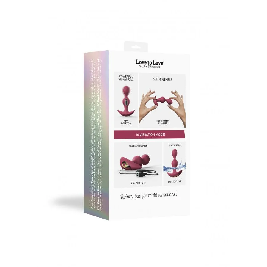 У анального стимулятора Love To Love TWINNY BUD кульки щільні, але не жорсткі, злегка пружні, що ідеально для початківців. Після повної зарядки буде працювати до 90 хвилин.