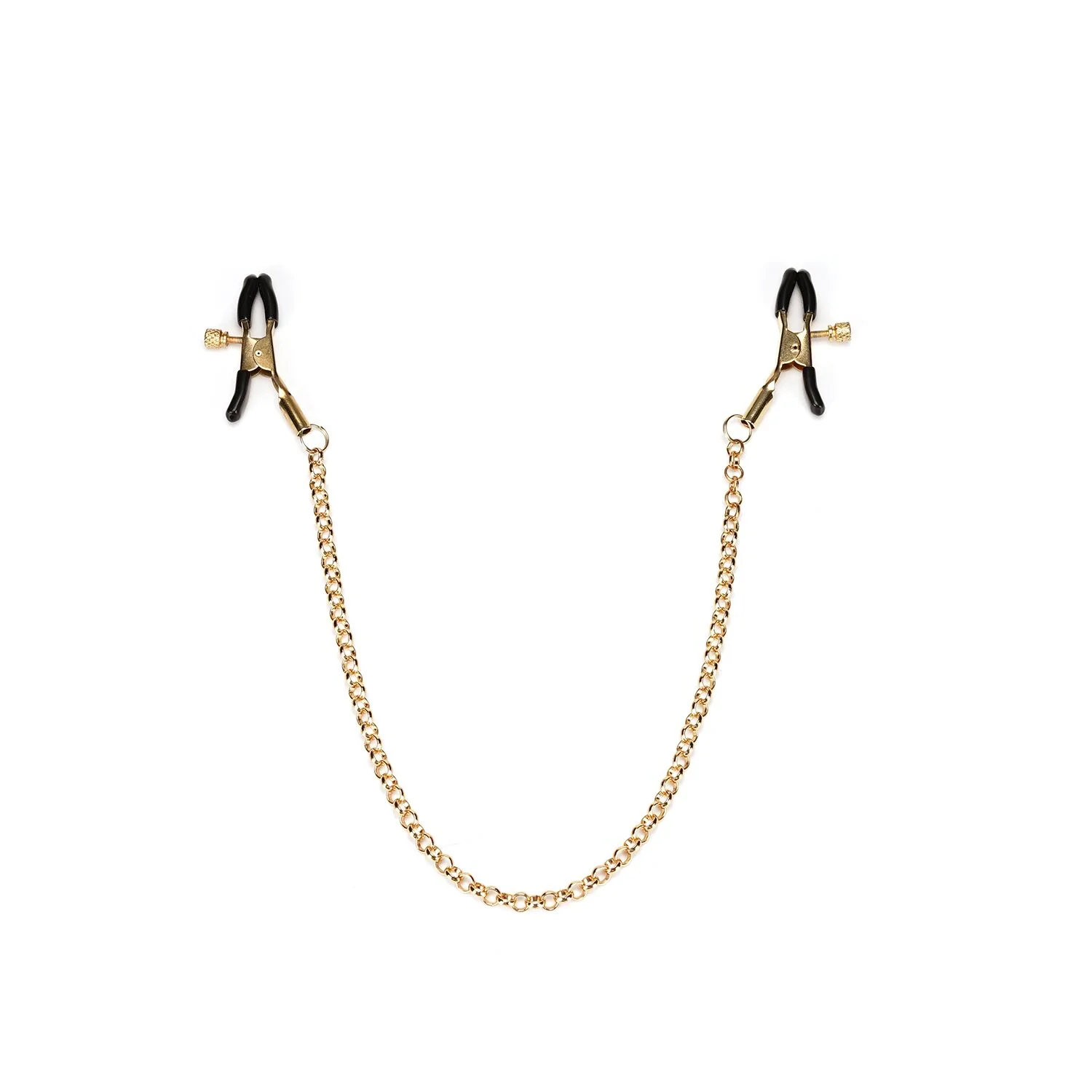 Затискачі на ланцюжку для сосків. Затискачі загвинчуються, щоб відрегулювати силу стискання. Силіконові накладки дають змогу не пошкодити сосок навіть за дуже сильного впливу! Ланцюжок має не просто шикарний вигляд, але й дає можливість додатково пограти з відчуттями: легко потягніть за ланцюжок, щоб враження від затискачів стали більш яскравими. Загальна довжина (затискачі + ланцюжок): 48 см.