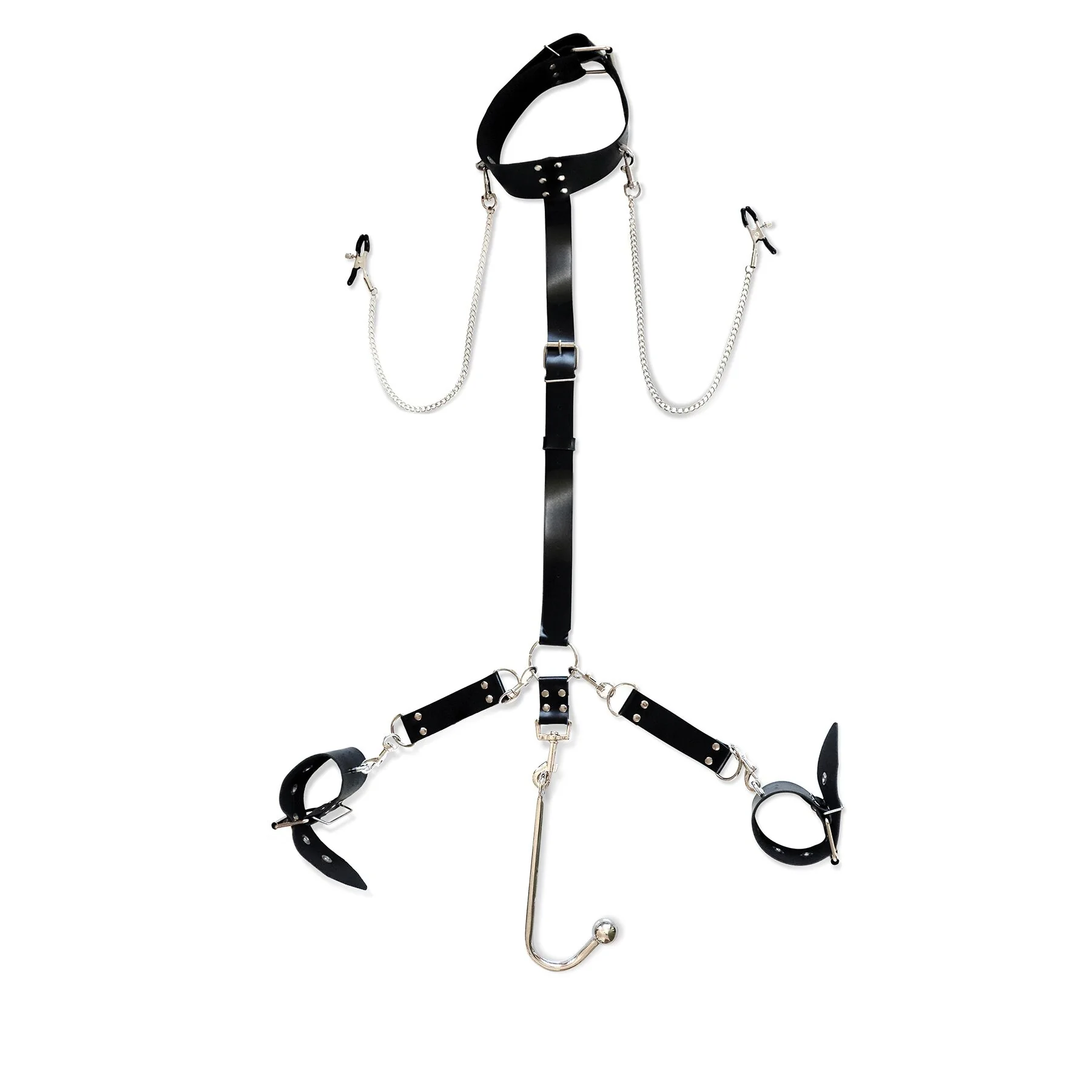 Нашийник та наручники легко регулюються, щоб їхнє використання було зручним. Затискачі для грудей мають силіконові накладки для запобігання травматизму, а також регулятори, щоб змінювати силу стиснення на ваш смак. Анальний гак ідеально поєднується з будь-яким лубрикантом і легко очищається після використання.
