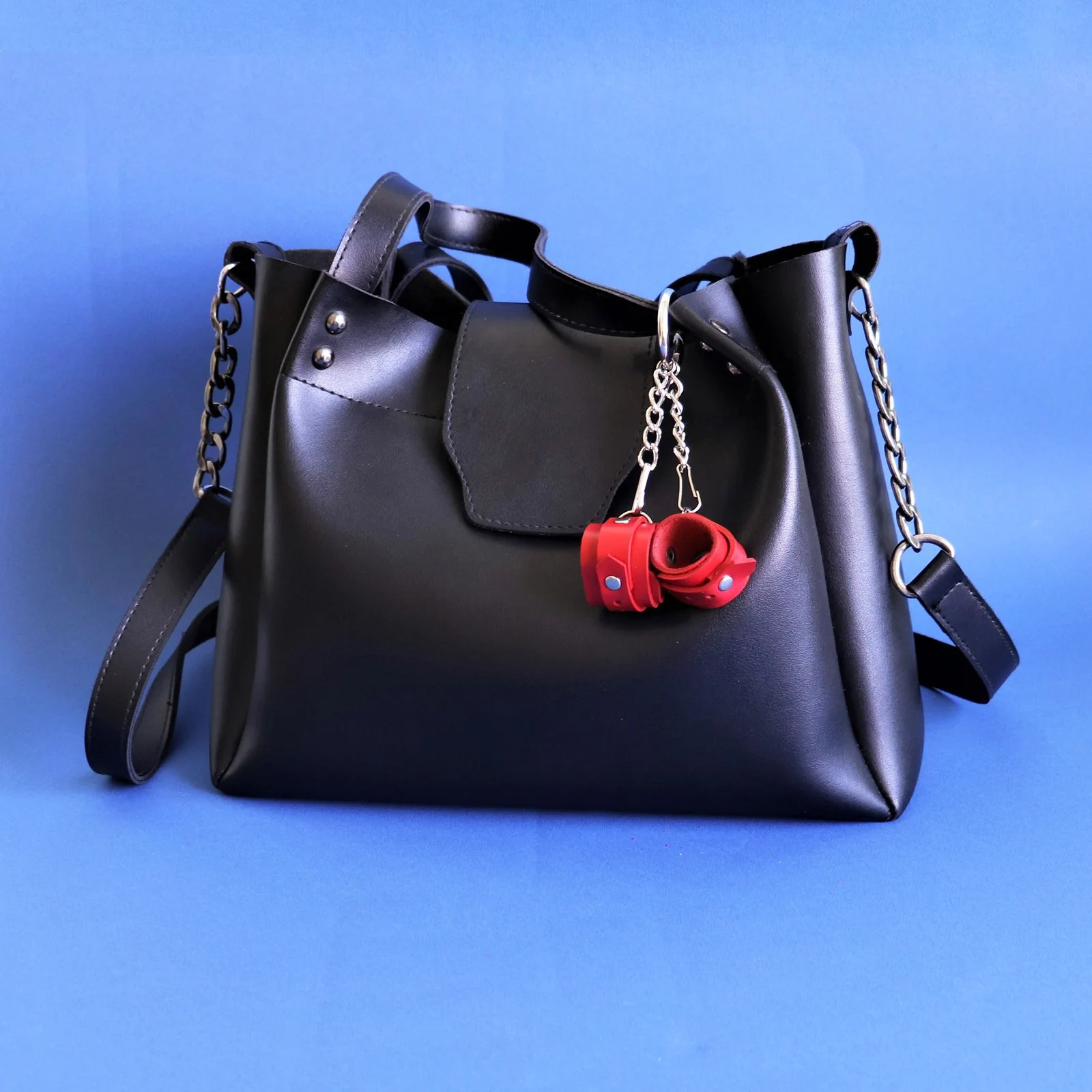 Міні-наручники з натуральної шкіри рослинного дублення, прикрашені хольнітенамі (заклепками). Кожен наручник кріпиться до основного кільця-карабіну ланцюжком і міні-карабіном, тому можна носити тільки один наручник, а другий – подарувати своєму партнеру у якості символу.