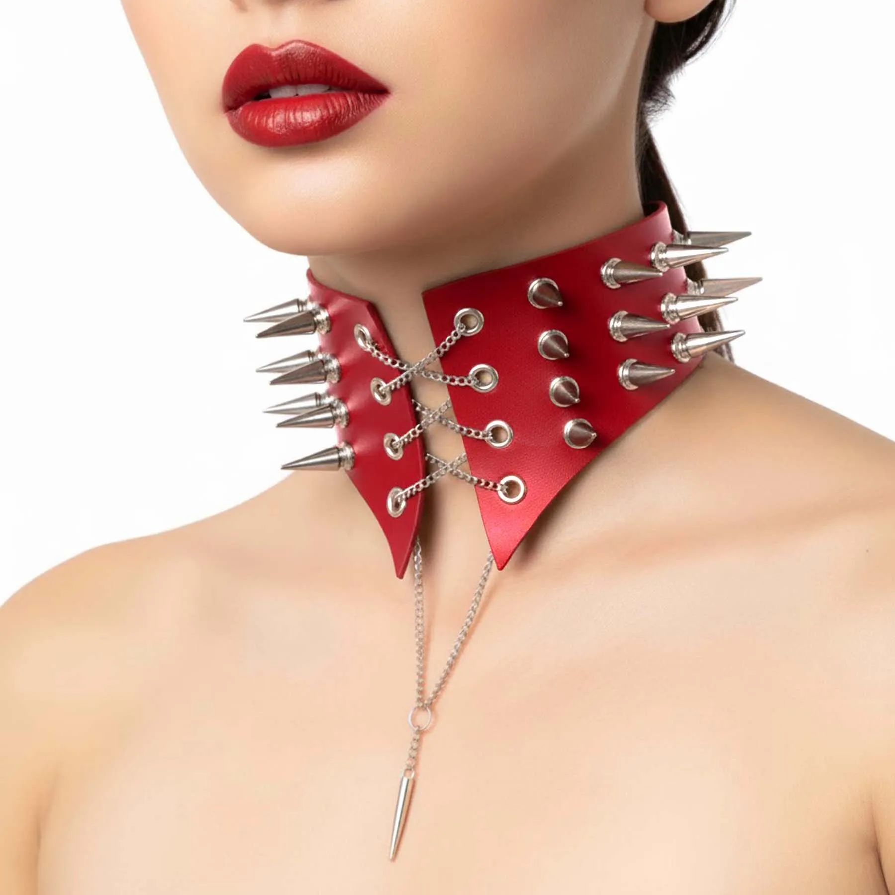Бічні шипи додають агресії та характеру — це деталь, яка працює з будь-якого ракурсу. Спереду — провокаційна шнурівка на ланцюгах. Переплетення металу створює напруження, посилює драму й притягує погляд до центру композиції. Підвіска додає динаміки — у русі вона вловлює світло та підсилює ефект.