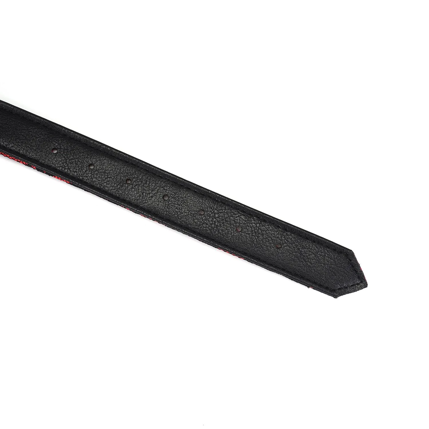 Червоний чокер декорований чорним мереживом із шикарним малюнком та доповнений металевим кільцем, яке також можна використовувати для кріплення повідця. Застібається чокер за допомогою пряжки, що дає змогу зручно регулювати його довжину.