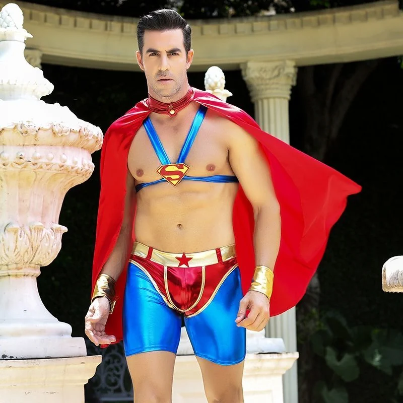 Представляємо вам яскравий костюм, який підкреслить чоловічу гідність і потужні груди завдяки особливій конструкції. Костюм складається з еластичних шорт, заклично обтягуючих і спереду, і ззаду, золотистих напульсників, покликаних підкреслити силу рук і перехресних на грудях стрічок. Червоний плащ і впізнаваний значок "S" довершують образ супергероя.