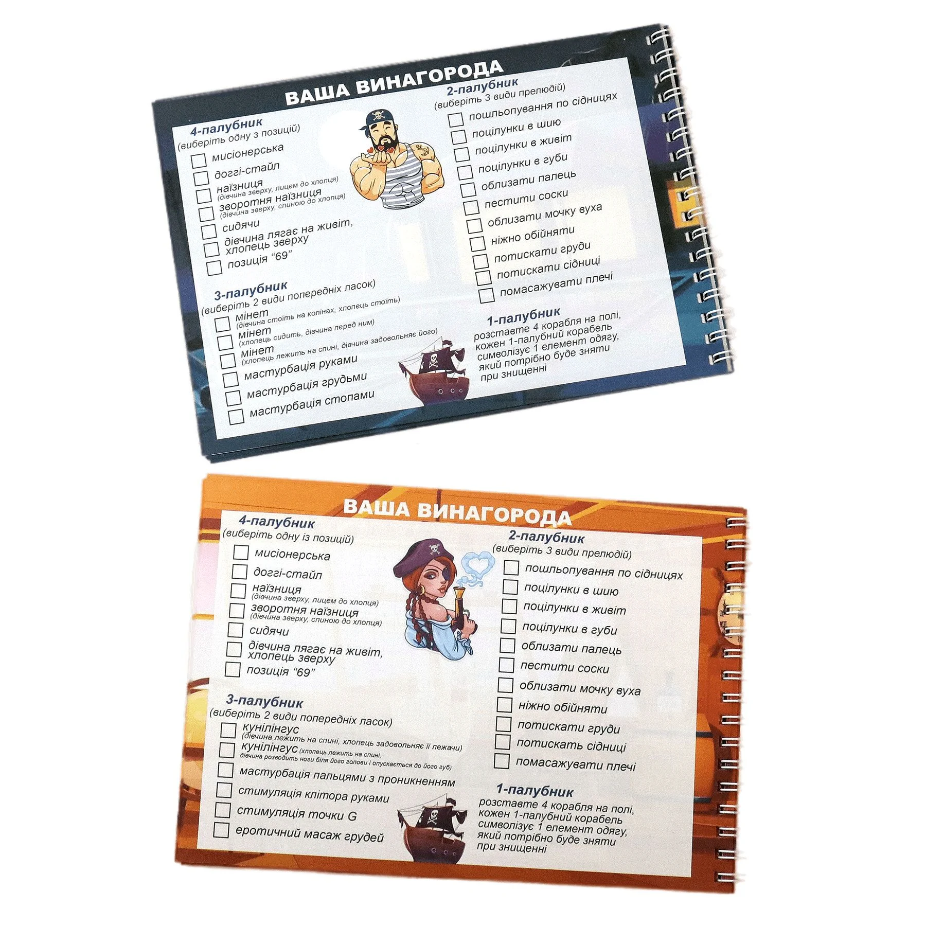 Як грати в еротичну гру "Морський бій. Постільна версія "? Кожен бере свій блокнот (блокноти відрізняються переліком попередніх ласк) і на своєму полі розміщує кораблі: чотири однопалубних, три двопалубних, два трипалубних і один чотирипалубний. Далі грайте в звичайний морський бій. Той, хто збиває однопалубний корабель, обирає елемент одягу, який противнику потрібно зняти (1 корабель = 1 елемент одягу). За повністю збитий двопалубний корабель доведеться "розрахуватися" ласкою-прелюдією (наприклад, поцілувати в шию, потискати попу і т.д., на вибір, 1 корабель = 1 прелюдія). Збивши трипалубний, ви зможете вимагати у противника попередню ласку: мінет для чоловіка, кунілінгус для жінки або мастурбація руками (1 корабель = 1 ласка). Ну а той, хто повністю зіб'є чотирипалубний, буде обирати позу для сексу: догі-стайл, місіонерська, наїзниця, 69 або іншу. Так гра перейде в гарячу інтимну близькість!