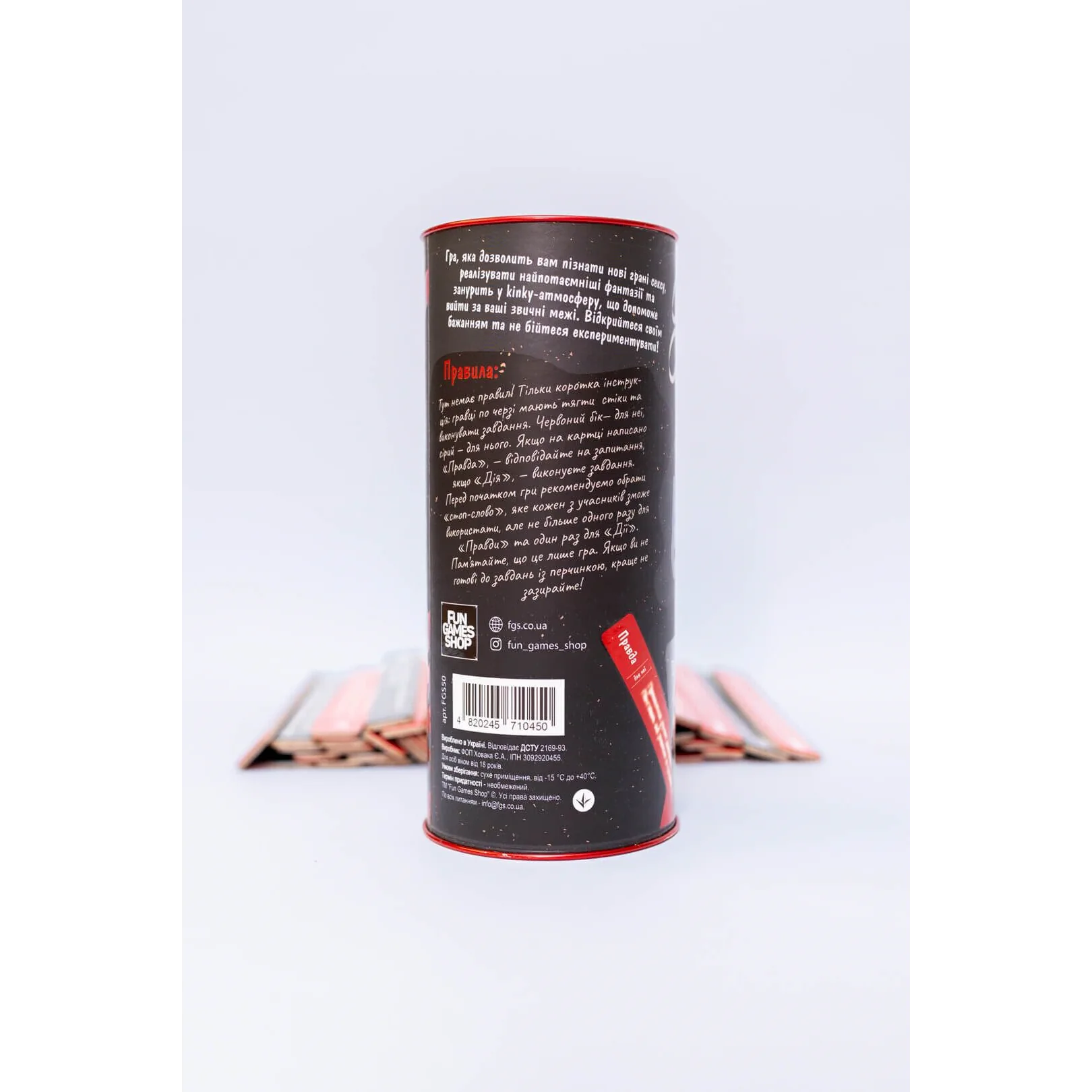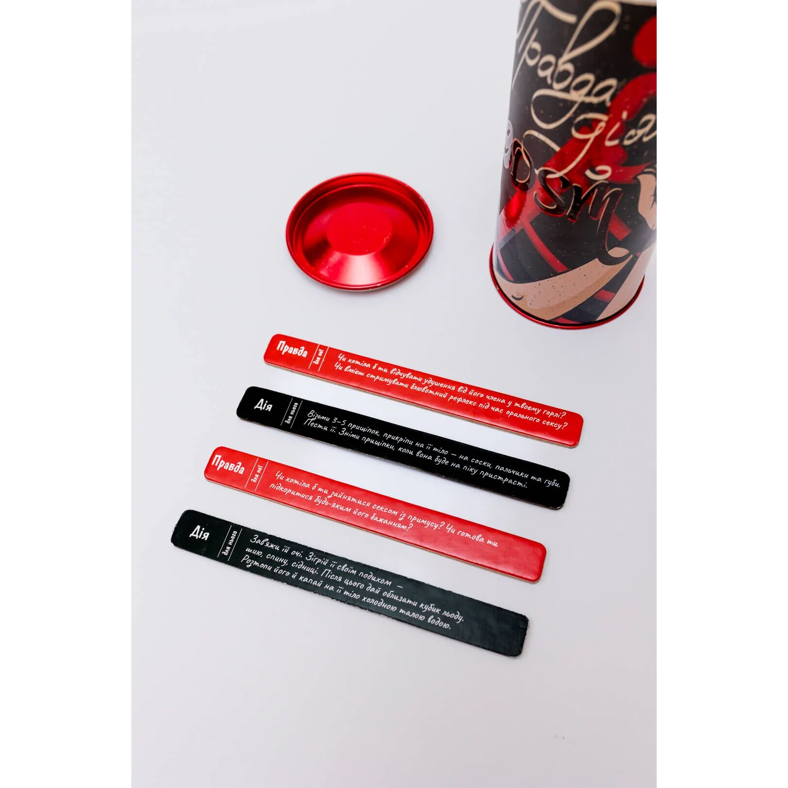 Коротко про правила: Тут немає правил! Тільки невелика інструкція: ви по черзі тягніть стіки. Червона сторона – завдання для неї, Сіра – завдання для нього. Якщо на стик написано «Правда» – відповідайте на питання, якщо «Дія» – приступайте до завдання. Перед початком гри рекомендуємо вибрати «стоп-слово», яке кожен з учасників може використовувати, але не більше одного разу для стіків «Правда» і «Дія». Пам'ятайте, це гра. Але якщо ви не готові, краще не дивіться під кришку!