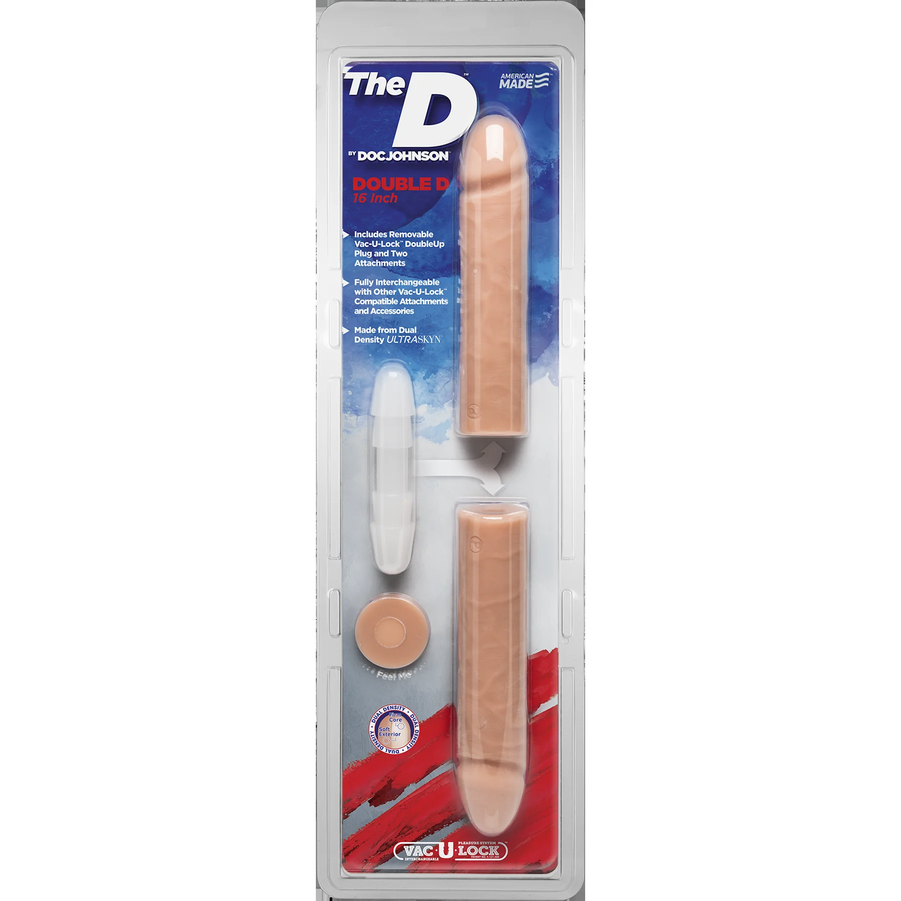 Пропонуємо придбати подвійний фалоімітатор Doc Johnson The D – Double D 16". Ця модель являє собою 2 однакових фалоімітатори, виконаних з сучасного матеріалу ULTRASKIN, і двостороннє кріплення Vack-U-Lock. На дотик ULTRASKN ідентичний людській шкірі, а пошарове нанесення матеріалу забезпечує максимальну реалістичність: подвійний фалоімітатор всередині щільний і пружний, а зовні м'який і ніжний. Double D 16" має великі розміри (довжина одного фалоімітатора 20,5 см, діаметр 4,4 см) і призначений для парних ігор.