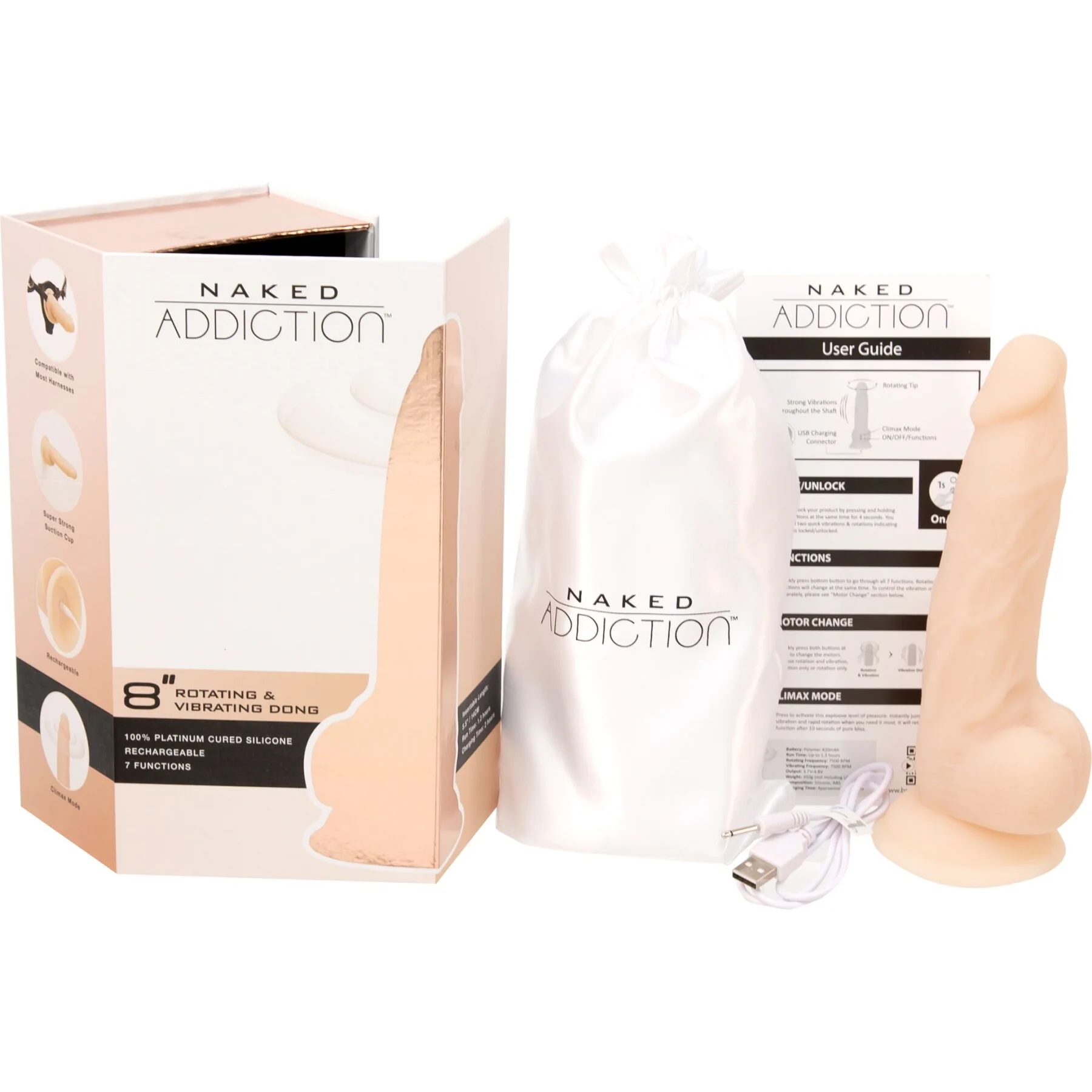 Фалоімітатор з вібрацією та ротацією Naked ADDICTION James 8″ працюватиме до 1 години, після чого його необхідно перезарядити протягом 2 годин. Кабель для заряджання в комплекті. У комплекті також докладна інструкція з керування іграшкою.