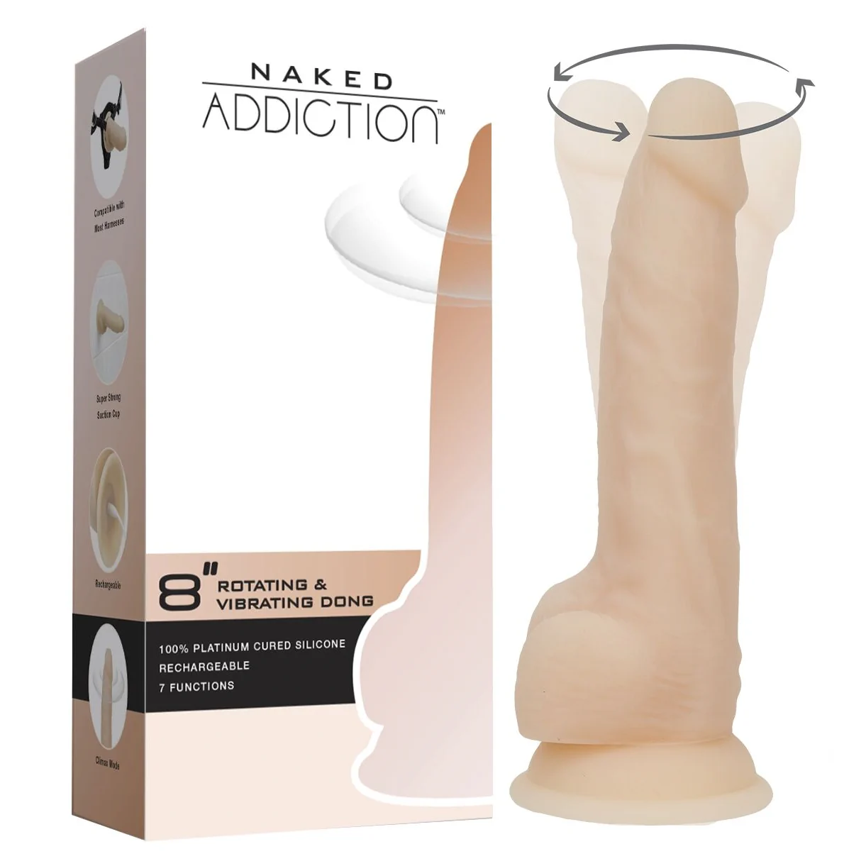 Чудова багатофункціональна іграшка для глибокого задоволення вашої пристрасті! Пропонуємо купити фалоімітатор з вібрацією та ротацією Naked ADDICTION James 8″: він не тільки потужно вібрує й обертається на 360° в 7 режимах (обидва мотори можуть працювати й синхронно, й автономно), але ще й надійно кріпиться до будь-якої гладенької поверхні та підходить до більшості ременів для страпона. Реалістична текстура, приємний та зносостійкий силікон преміальної якості, автономне керування вібрацією та ротацією — у ньому є все, щоб полетіти до країни еротичних фантазій. Додатковий бонус — пульт дистанційного керування в комплекті забезпечує комфортне перемикання режимів прямо в процесі!