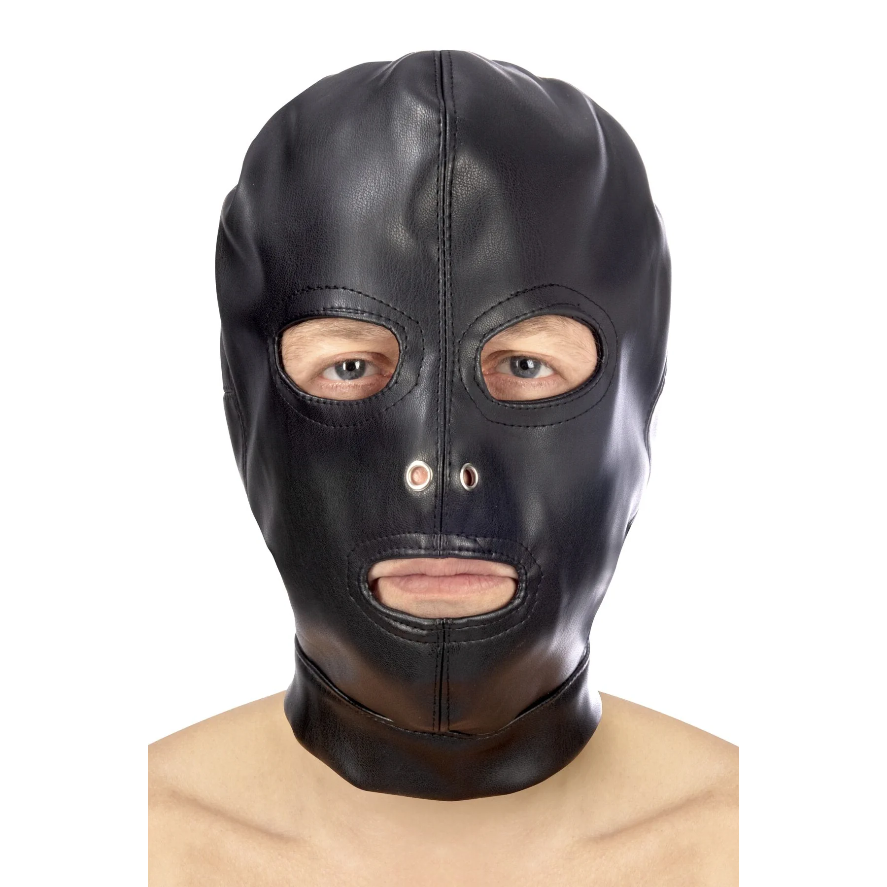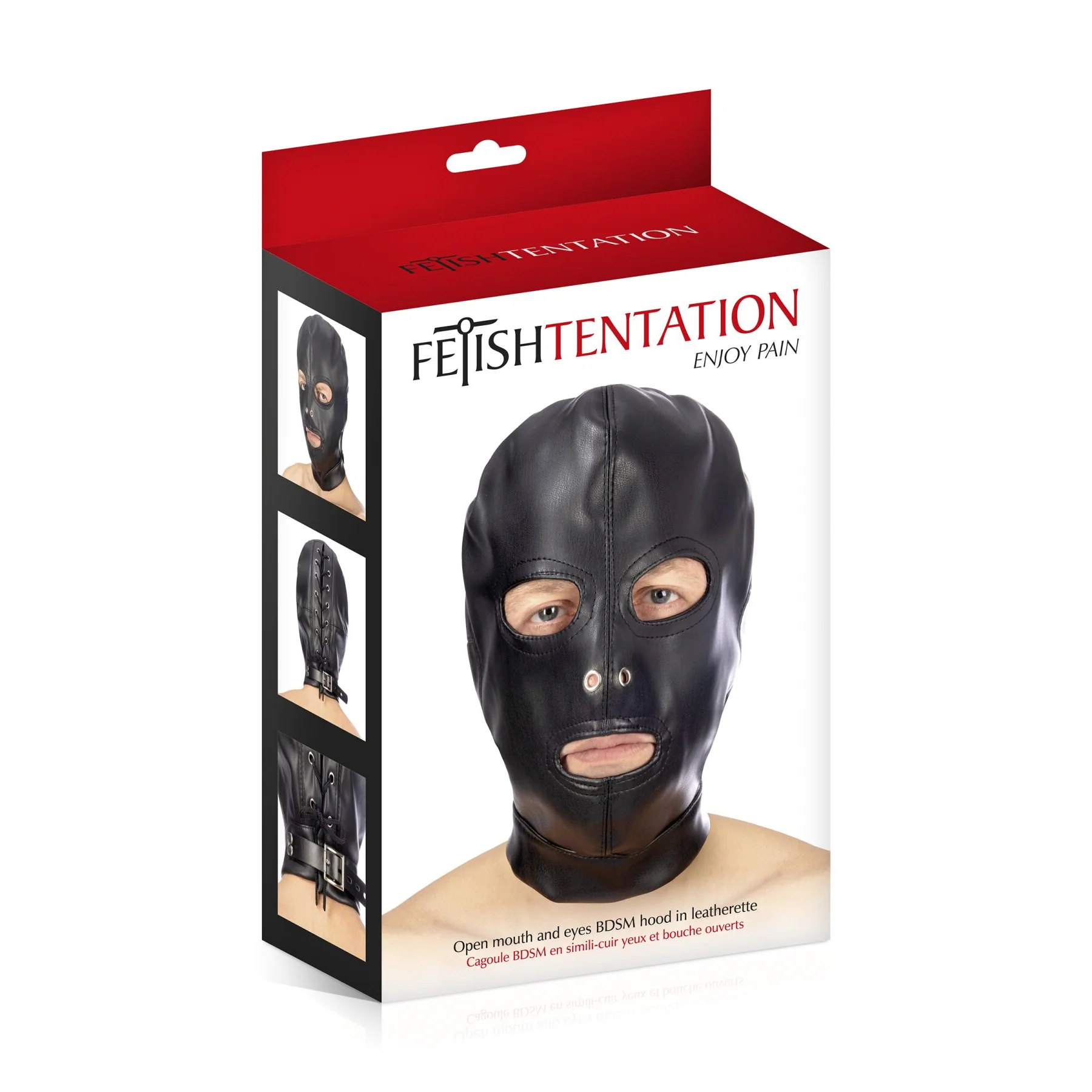 Пропонуємо придбати капюшон для БДСМ з відкритими очима і ротом Fetish Tentation Open mouth and eyes BDSM hood in leatherette – універсальний капюшон для ваших найбільш вражаючих БДСМ-заходів. Повністю закриває голову, але залишає доступ до рота і можливість бачити. Передбачені отвори для легкого подиху.