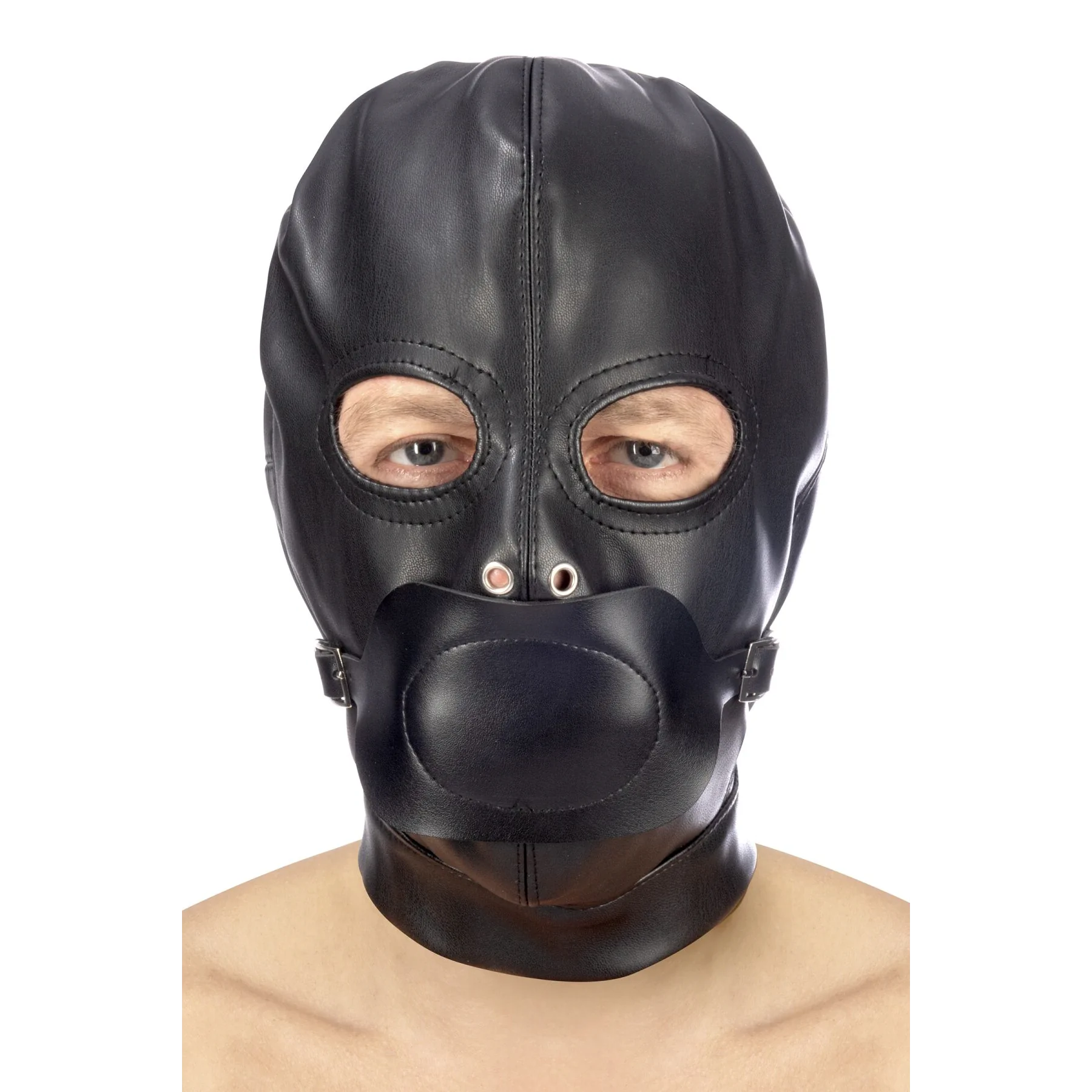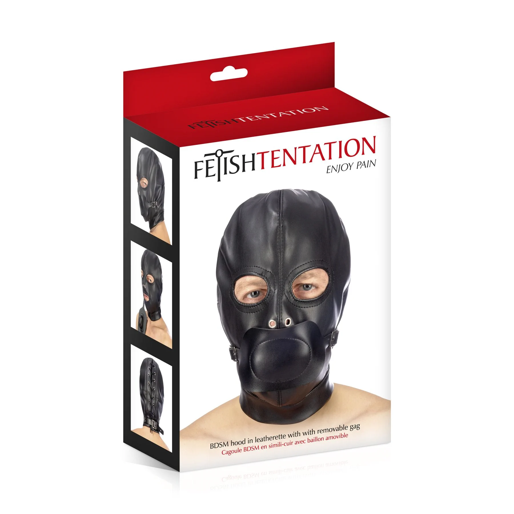 Пропонуємо придбати капюшон з кляпом для БДСМ Fetish Tentation BDSM hood in leatherette with removable gag – зручну модель для найкрутіших БДСМ-сесій! Кляп кріпиться на ремінцях, тому його можна зняти при бажанні. Очі залишаються відкритими, також передбачені отвори для дихання.