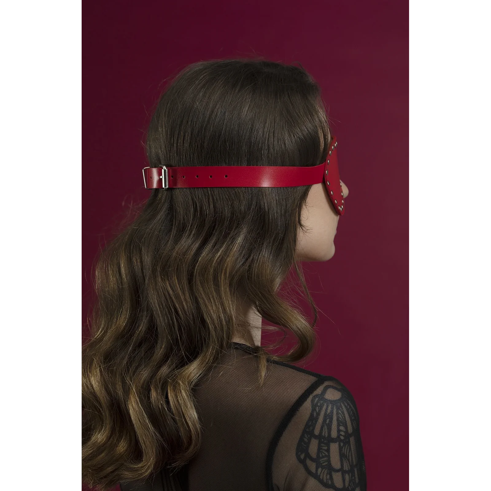 Шикарна маска з заклепками стане вашим улюбленим аксесуаром для ігор з зав'язуванням очей! Анатомічна форма повторює форму особи, забезпечуючи щільне прилягання і не пропускаючи світло. Виготовлена з високоякісної шкіри рослинного дублення та доповнена стильною фурнітурою сріблястого кольору.
