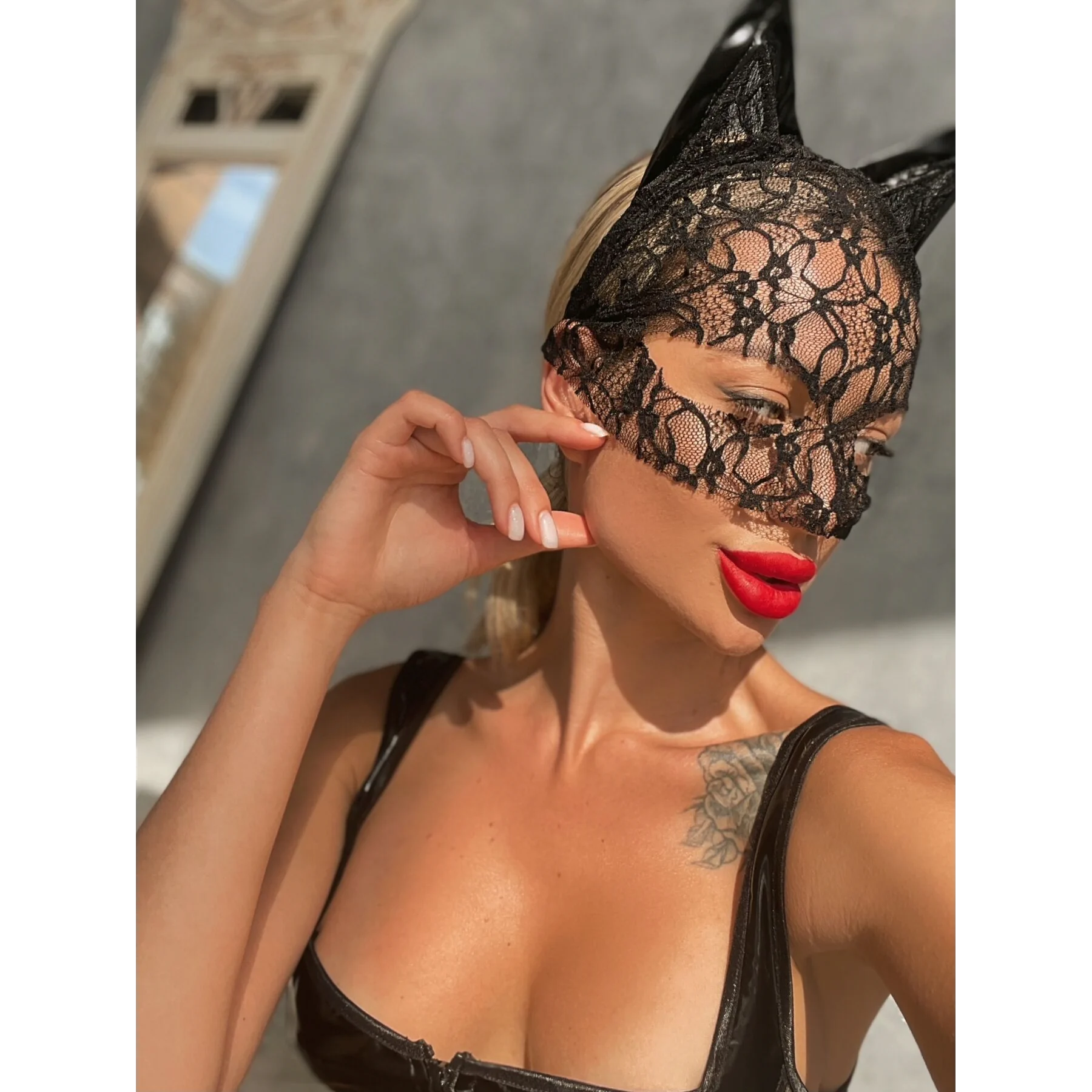 Мереживна маска "Кішка" виготовлена ??з м'якого і ніжного еластичного мережива, приємного для шкіри обличчя, яке не буде доставляти незручності при використанні. Модель мереживної маски "Кішка", нагадує вуаль з красивими прорізами для очей, а обруч, з грайливо стирчащіми вушками, на якому вона кріпиться, дозволить Вам легко її надіти або зняти. Завдяки тому, що краю вушок оброблені лакованим матеріалом, така маска буде добре поєднуватися як з класичною мереживною білизною, так і з більш сміливими і зухвалими лакованими комплектами.