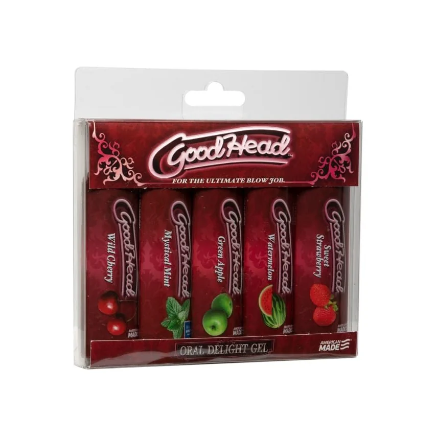 Ніжний смачний гель тепер не тільки освіжає подих, а й робить мінет максимально приємним для обох учасників процесу! Рекомендуємо придбати змазку-гель для орального сексу Doc Johnson GoodHead, набір 5х29 мл – відразу 5 упаковок з різними смаками під будь-який настрій: полуниця, вишня, кавун, м'ята і яблуко! Без цукру і парабенів, не липкий і дуже-дуже густий, цей гель для орального сексу полегшує ковзання під час мінету і ніжно обволікає горло для максимально приємних відчуттів.