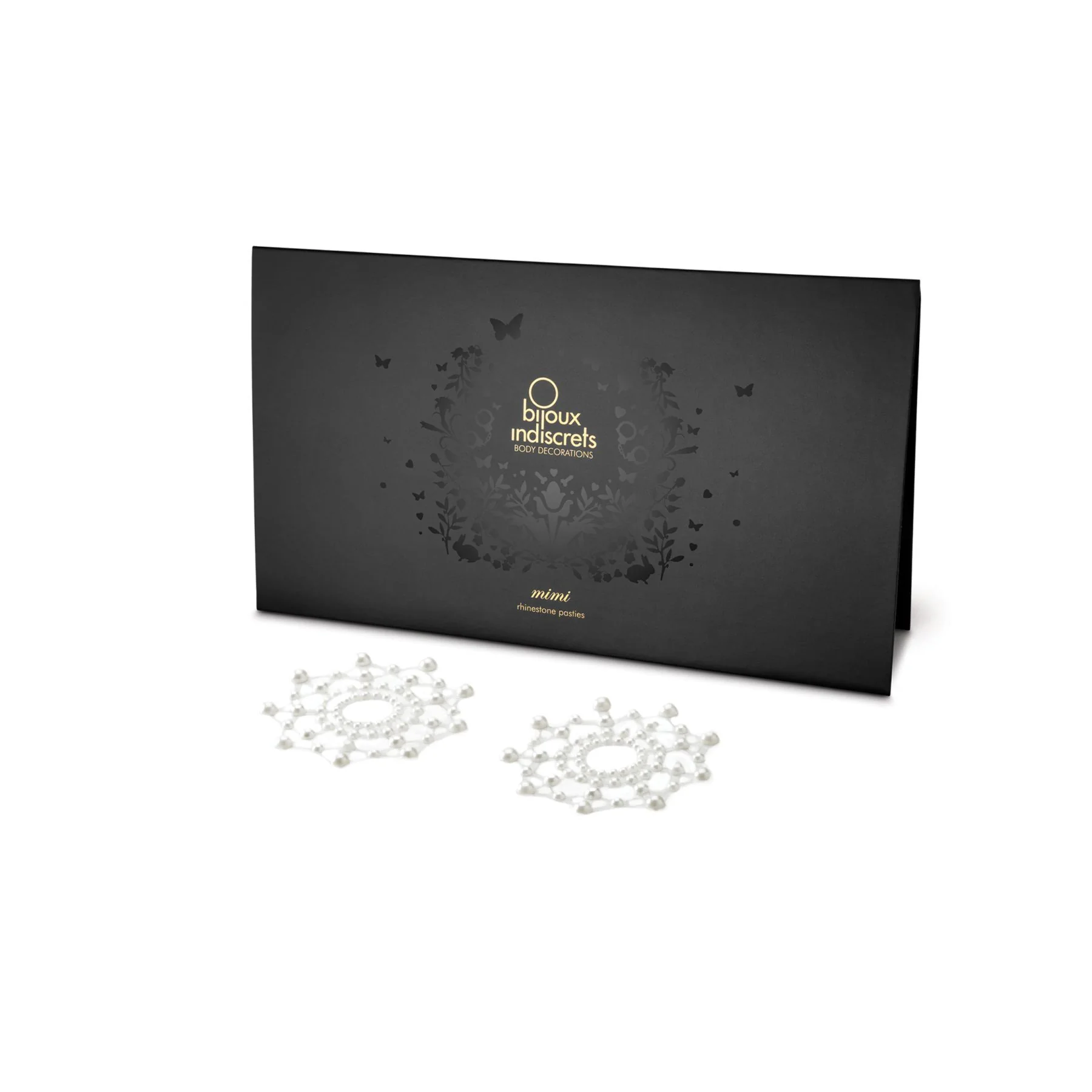 Bijoux Indiscrets MiMi – грайливе і дуже незвичайна прикраса для грудей зробить їх ще більш сексуальними і чарівними. Композиція зі стразів складає парні аксесуари з кристалів кольору перлин. Їх слід наклеїти таким чином, щоб сосок виявився у центрі кола. Кристали легко кріпляться за допомогою самоклеючої основи, що робить їх неймовірно зручними у використанні. Прикраси призначені для одноразового використання, однак якщо користуватися ними акуратно, багаторазове застосування стає можливим. Просто нанесіть на основу крапельку клею для вій (тільки для зовнішнього використання!) перед тим, як прикріпити прикраси до шкіри.