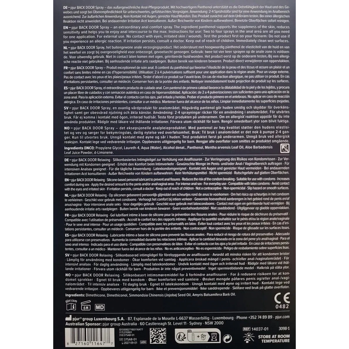Склад pjur BACK DOOR Spray: Propylene Glycol, Laureth-4, Aqua (Water), Alcohol denat., Panthenol, Mentha arvensis Leaf Oil, Aloe Barbadensis Leaf Juice Powder, d-Limonene.