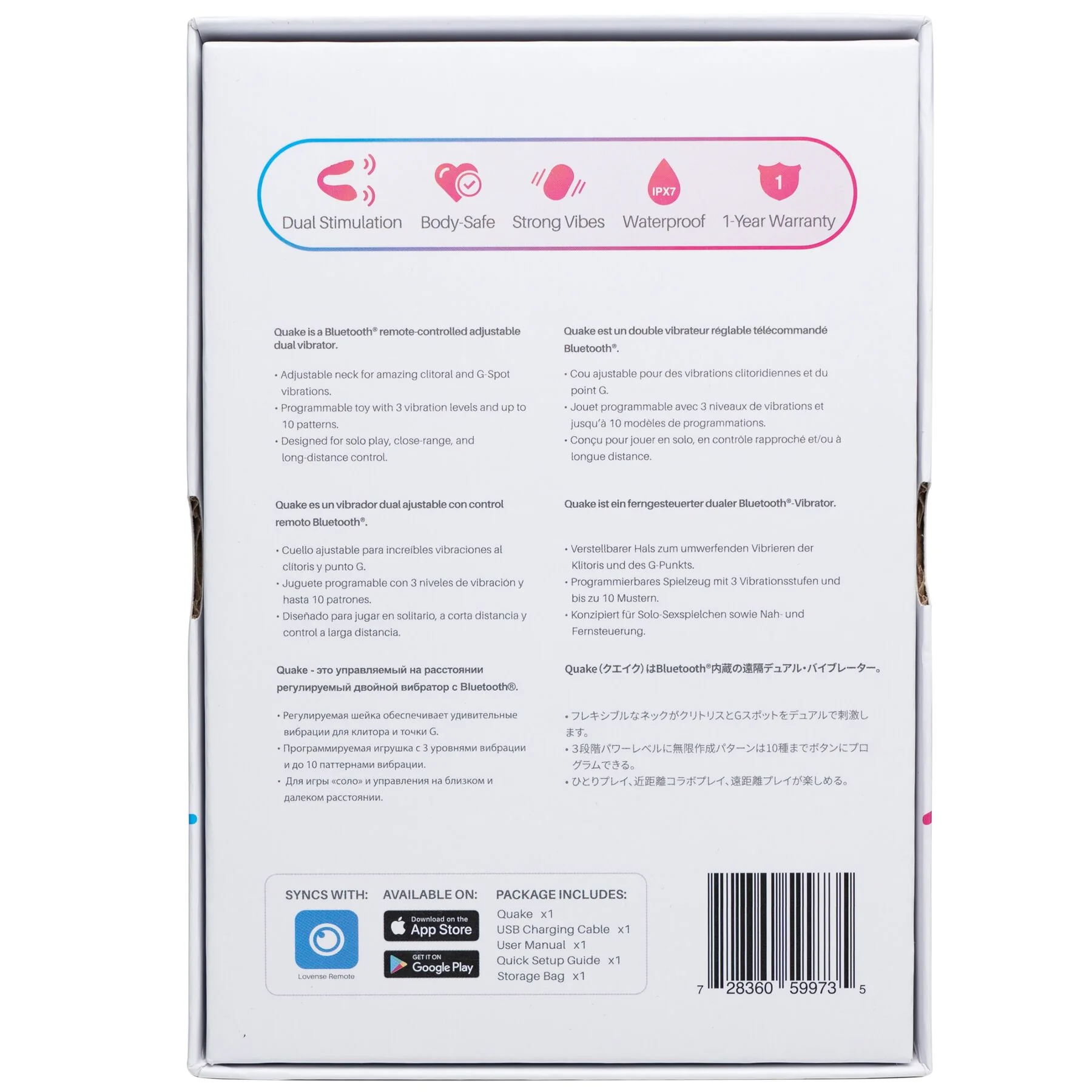 Зверніть увагу: при синхронізації зі смартфоном додаток бачить даний вібратор як Lovense Dolce. Справа в тому, що Lovense Quake – це перша лімітована серія даного вібратора! Надалі він буде випускатися під назвою Lovense Dolce при повністю ідентичному функціоналі. Подвійний смарт вібратор Lovense Dolce (Quake) повністю водонепроникний (IPX7), так що його можна взяти і в джакузі. Час роботи вібратора до 120 хвилин, час зарядки 70 хвилин (під час зарядки горітиме червоний індикатор, який згасне, коли вібратор зарядиться). У комплекті атласний чохол.