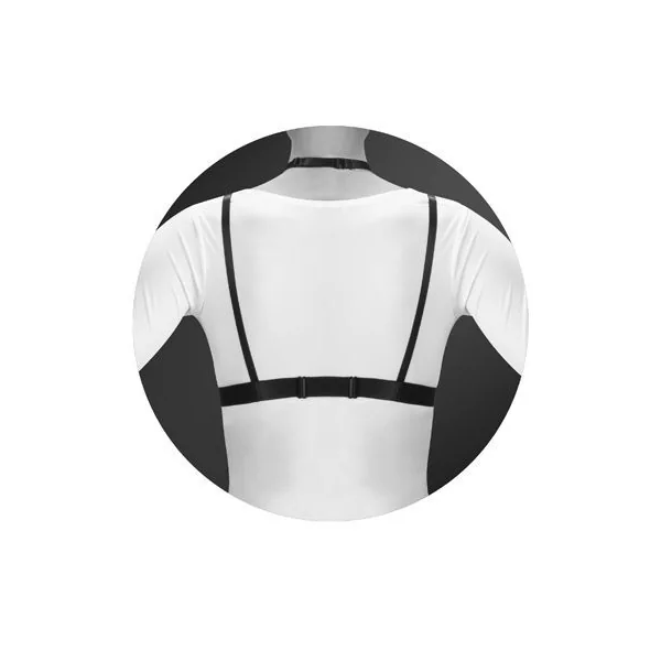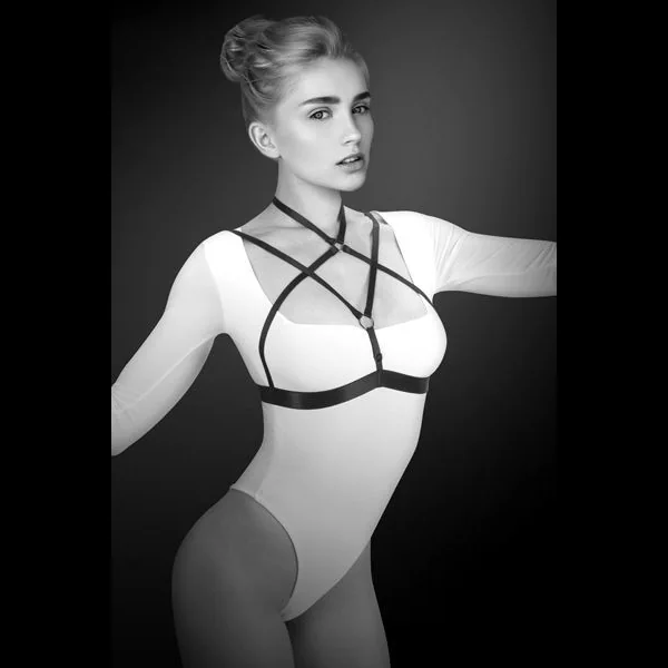 Цікаве переплетення ременів може вдало підкреслити і невеликі акуратні груди, і досить пишні форми. Така модель підійде для обох випадків завдяки широкому основному ременю. Портупея відрізняється наявністю кріпильних кілець в декількох місцях, а також зручною застібкою на спині. Довжину плечових ременів можна регулювати, забезпечуючи портупеї щільну посадку. Виготовлена модель з еластичного поліестеру.