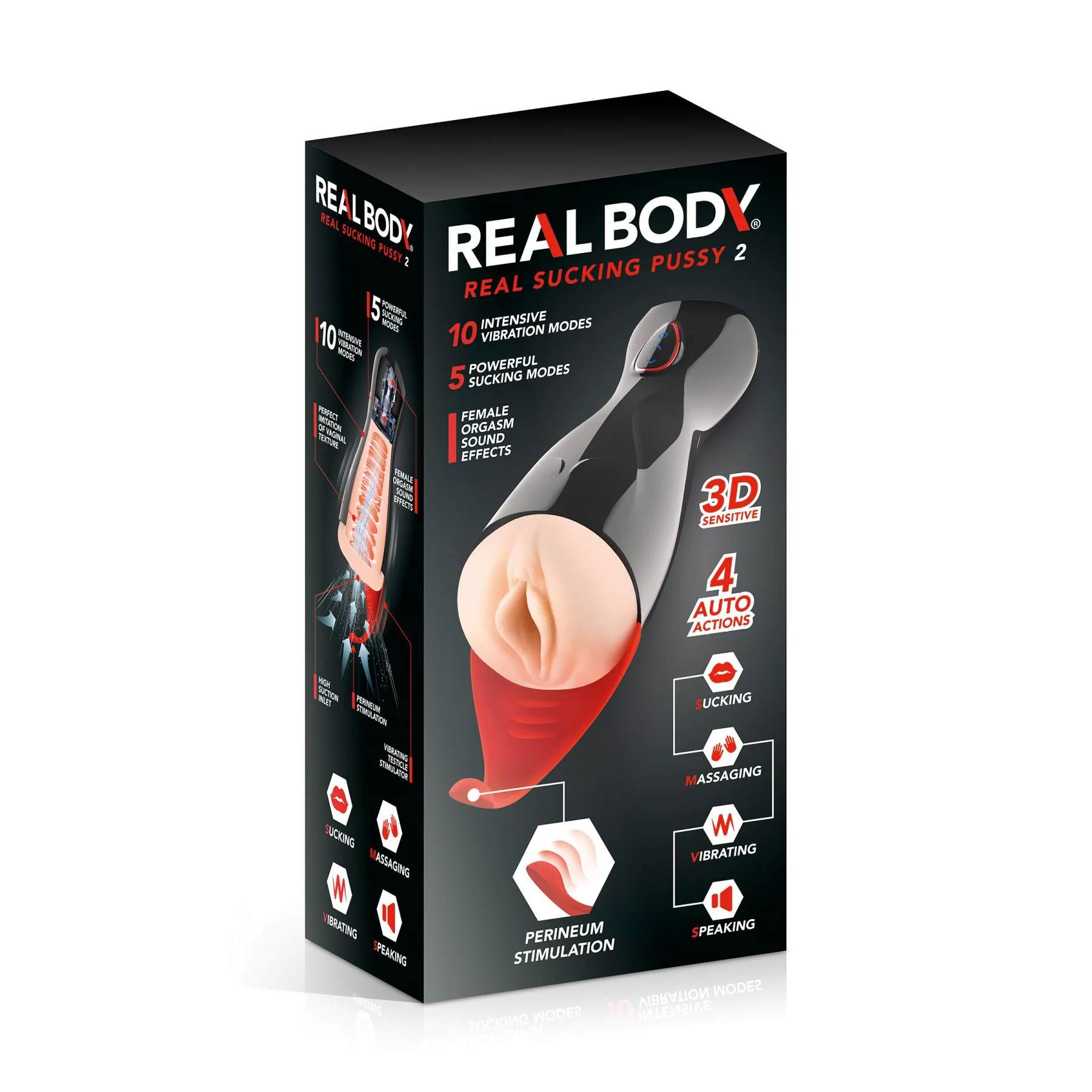 Мастурбатор для найвибагливіших! Навіть якщо ви вже спробували безліч найрізноманітніших іграшок, преміум-мастурбатор Real Body — Real Sucking Pussy 2 здатен вас здивувати (і, звичайно, задовольнити за повною програмою). У ньому поєднується відразу 4 ефекти: вібрація, всмоктування, аудіоефекти та стимуляція промежини. Крім того, цей мастурбатор підкорить вас реалістичністю, якістю виконання та продуманими деталями.