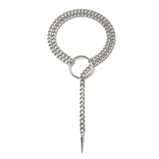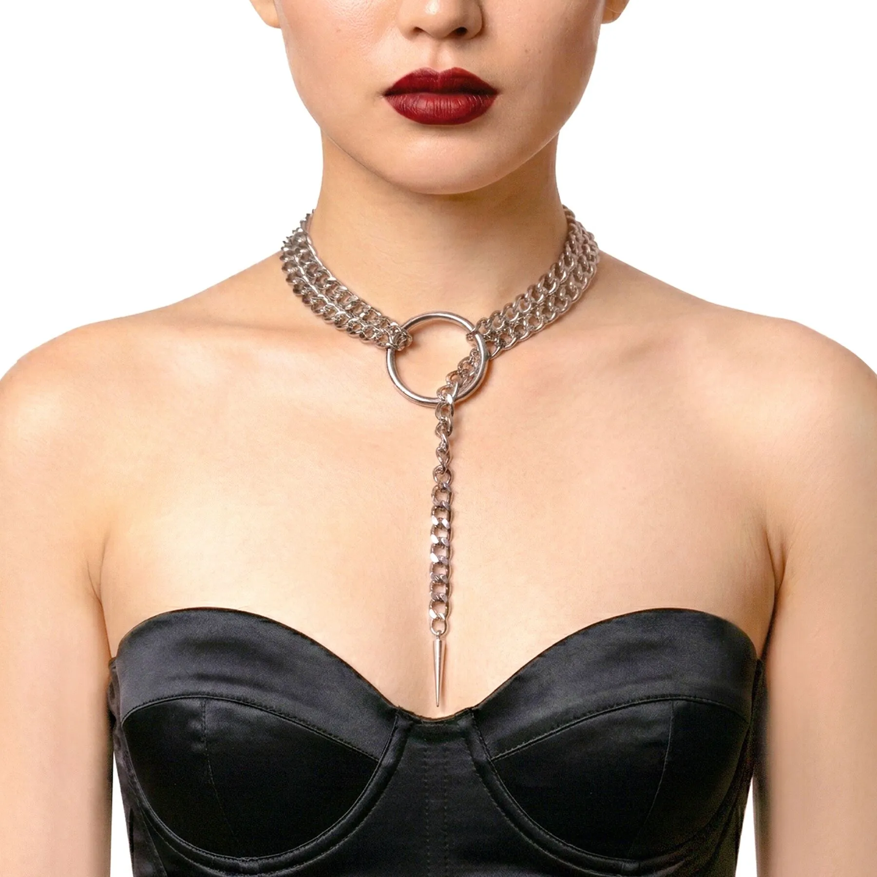 Ефектна прикраса з масивним ланцюгом і центральним кільцем створює сильний акцент і привертає увагу з першого погляду. Довга підвіска візуально витягує силует і підкреслює лінію декольте.