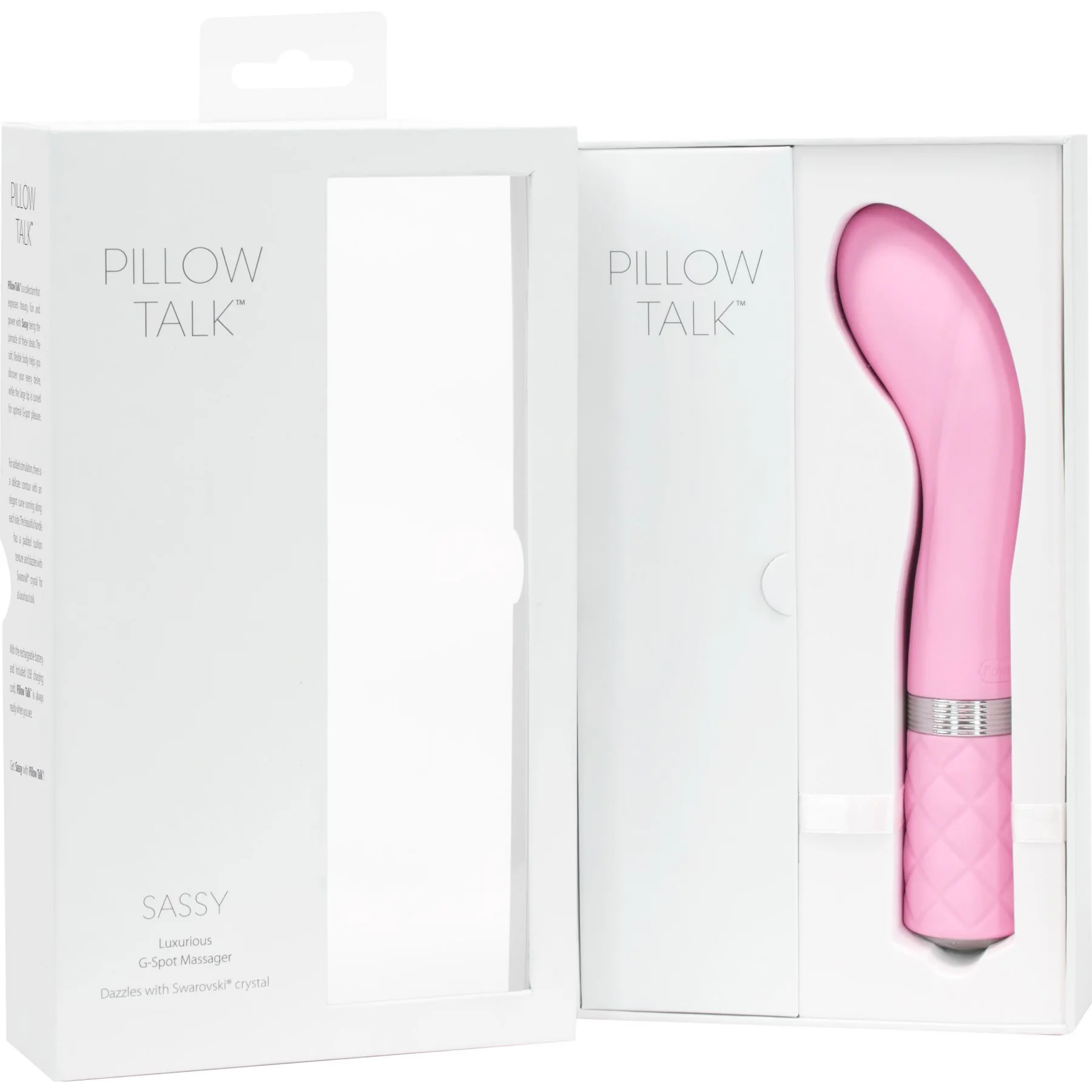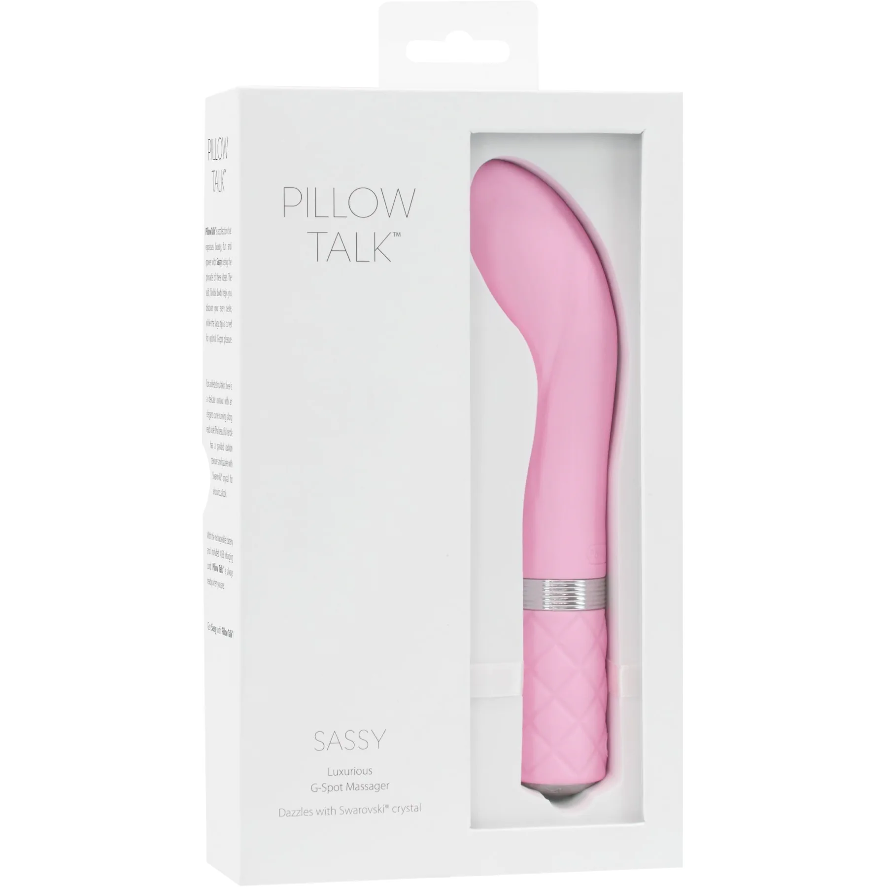 Ідеальні лінії, розкіш, що вабить і потужна вібрація – і ви просто не в силах встояти перед тим, щоб купити розкішний вібратор Pillow Talk – Sassy Pink c кристалом Swarovski. Особливий дизайн з гнучкою голівкою дозволяє ніжно впливати прямо на точку G відповідно до ваших анатомічних особливостей. Витончені лінії і вишуканий кристал роблять цю модель по-справжньому шикарною, а унікальна кнопка, для плавно наростаючої вібрації, забезпечить вам таке задоволення, про яке ви могли тільки мріяти.