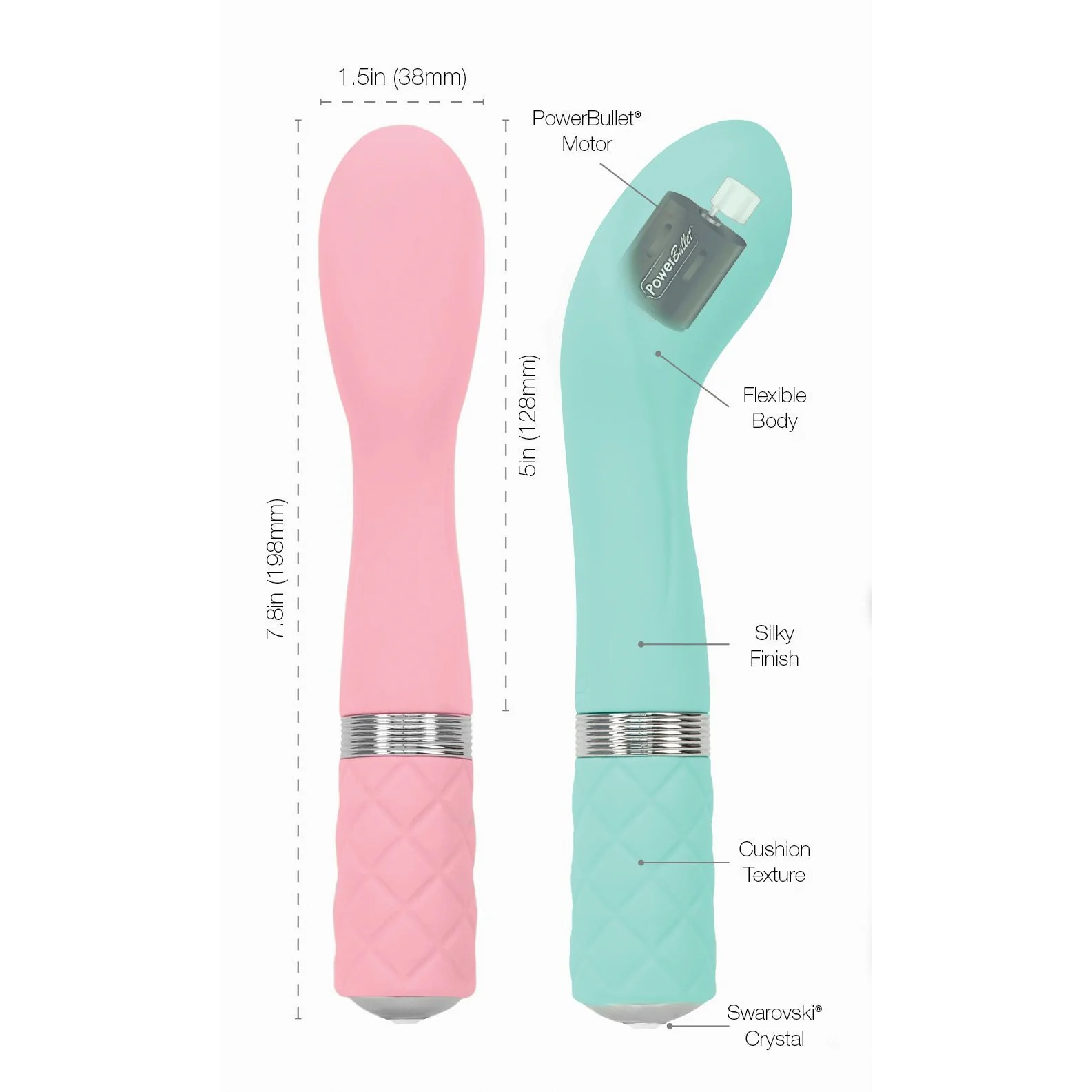 М'який силікон, гнучкий корпус і плавно наростаюча вібрація плюс ідеально загнута голівка – ось формула вашої ідеальної насолоди. Дві тонких борозенки з боків забезпечують додаткову стимуляцію. Красива текстурирована ручка не ковзає і зручно лежить у руці, а неперевершений кристал Сваровські робить зовнішній вигляд цього вібратора, без перебільшення, сліпучим. Порт для зарядки не псує ефект, адже він практично не помітний (відзначений літерами DC). Натискання кнопки, розташованої під кристалом, вмикає і вимикає вібратор. Поки кнопка затиснута, вібрація буде зростати, відпускаєте кнопку – і вібрація залишається на обраному рівні. Щоб повернутися до більш ніжного впливу, необхідно вимкнути і знову увімкнути масажер коротким натисканням кнопки. Така інтелектуальна турбо-кнопка дозволить вам отримати абсолютно нові відчуття і керувати вібратором так, як потрібно саме вам.