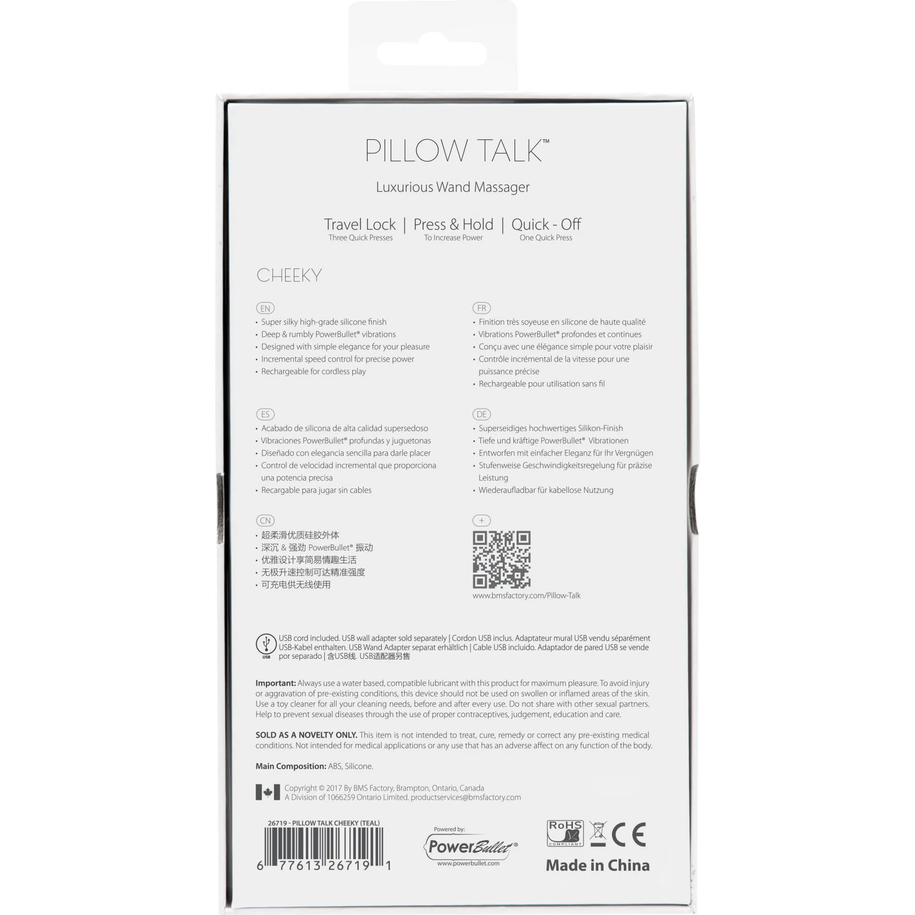 Зверніть увагу: рукоятка прикрашена розкішним кристалом Сваровські, який одночасно служить і кнопкою керування. Рукоятка зручного розміру і форми покрита малюнком, завдяки чому надійно лежить у руці. Гладка голівка забезпечена ребристою металевою вставкою для більш багатих відчуттів. Порт для зарядки закритий силіконовою заглушкою і практично не помітний (розташований внизу рукоятки, відзначений літерами DC). Вібромасажер упакований у дорогу красиву коробку з оглядовим віконечком, яка може послужити і подарунковим упакуванням.