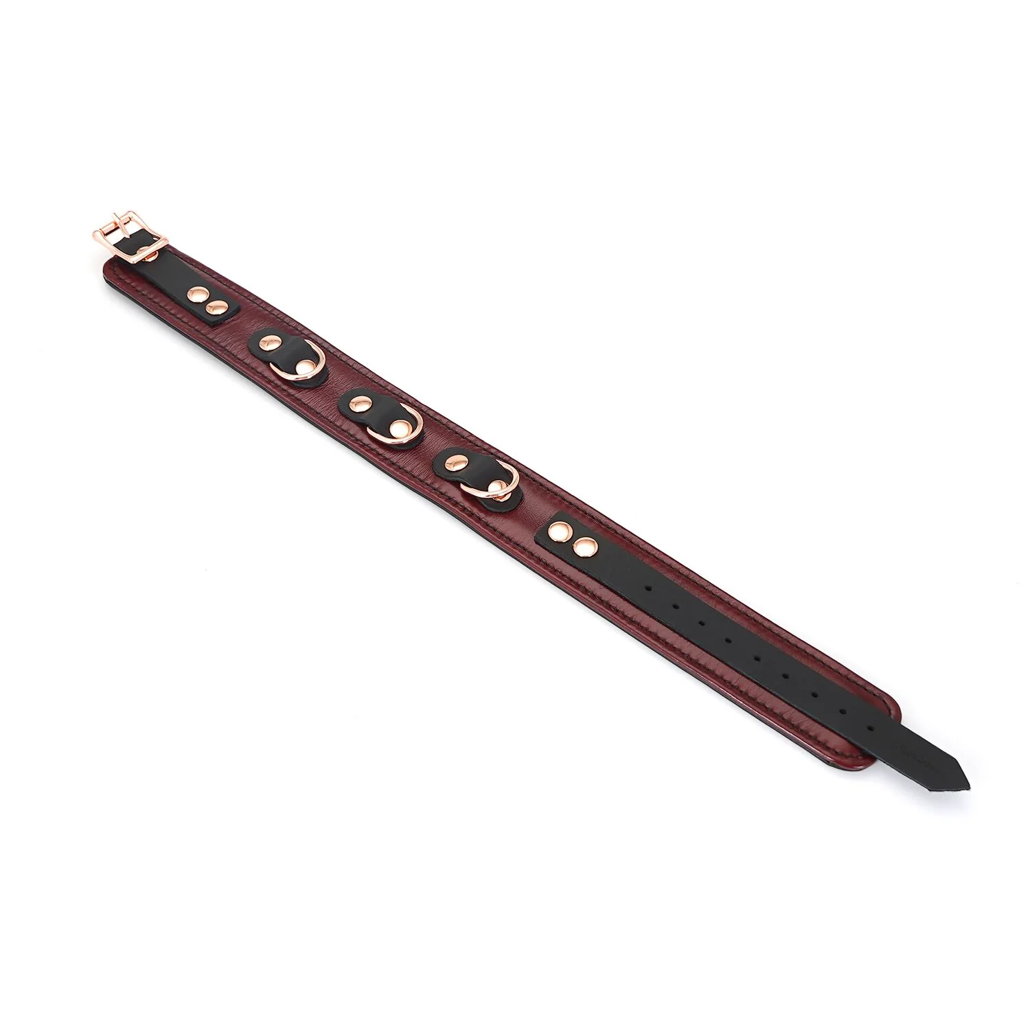 Колекція Wine Red — це елегантні БДСМ-аксесуари, натхненні спокусою та глибиною червоного вина. У колекції є все, що необхідно для захопливої гри, від нашийників та наручників до флогерів, шльопалок та фіксаторів. Кожен аксесуар виготовлений вручну зі шкіри тонкого вичинювання неймовірного винного відтінку та прикрашений металевими аксесуарами кольору рожевого золота.