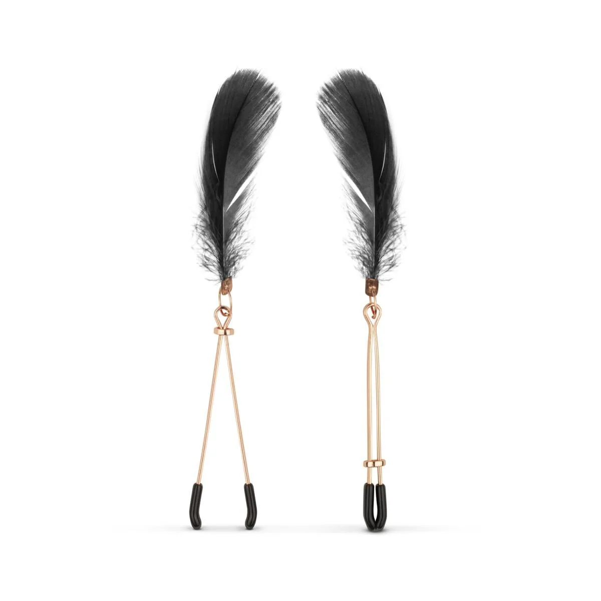 Набір виконаний зі штучної шкіри та фурнітури чорного та кольору рожевого золота. Це незвичне поєднання додає розкоші кожному аксесуару. М’які широкі наручники та поножі чудово фіксують зап’ястя та щиколотки, водночас не травмуючи їх. Ланцюжки з карабінами дають змогу з’єднати між собою аксесуари або приєднати їх до інших предметів — ліжка, хрестовини тощо. Тонкий стильний нашийник має дуже привабливий вигляд на ніжній шиї. Довгий повідець-ланцюг кріпиться до кільця на нашийнику. Металеві затискачі на соски захищені м’якими наконечниками, щоб не пошкодити ніжну шкіру грудей. Силу стиснення можна регулювати повзунком. Прикрашені затискачі чорними пір’їнками. Довга шльопалка і м’яка коротка лоскоталка можуть взаємовиключати один одного, а можуть працювати в парі: почергове ніжне погладжування і відчутне шльопання прикутого партнера можуть викликати бурю збудження. Закрийте коханому очі широкою атласною стрічкою — і сміливо проводьте чуттєві експерименти над його тілом, що прагне пестощів та покарань. Додайте до солодкої тортури крапельки воску зі свічки, яка тане за мінімальних температур, і ви отримаєте неймовірний набір, експериментувати з яким можна практично нескінченно.
