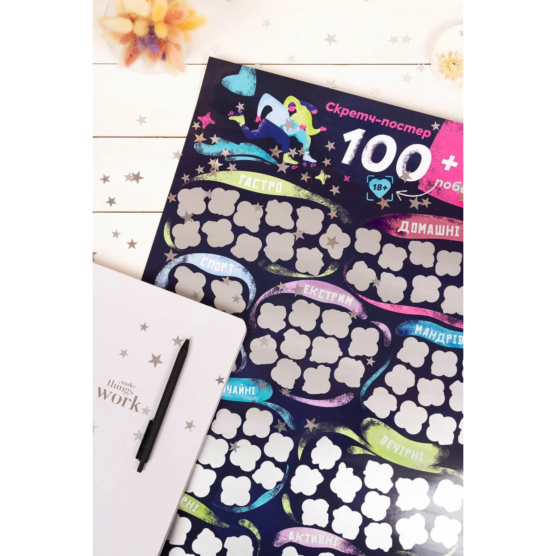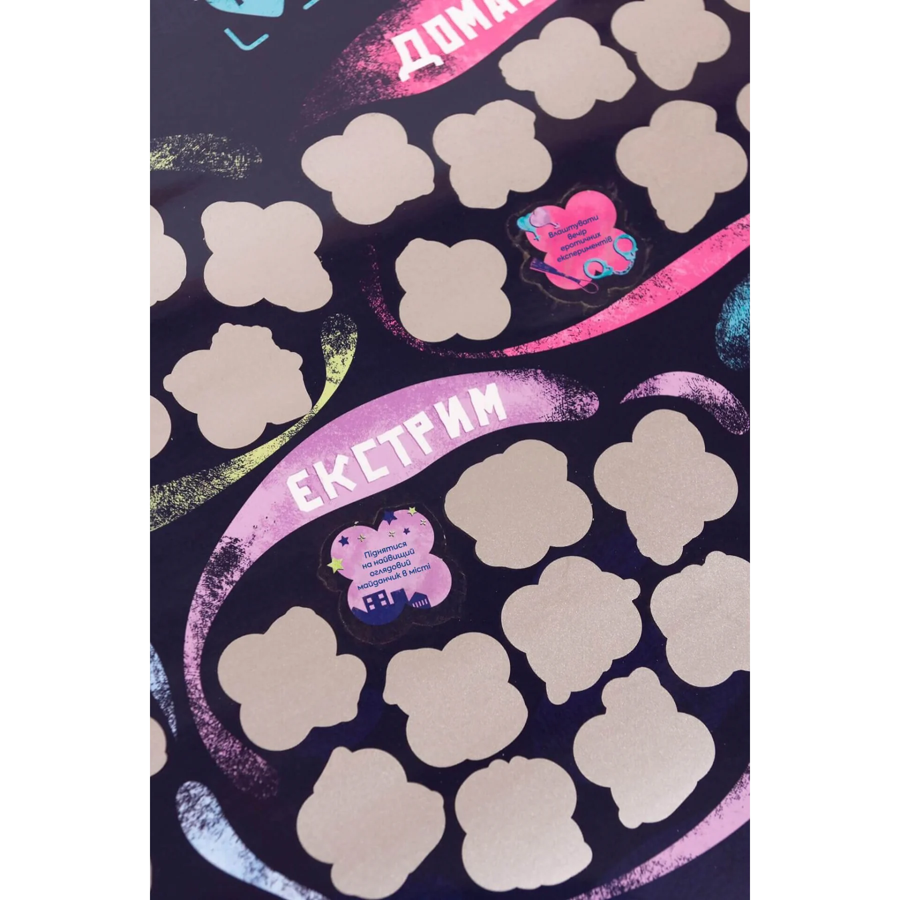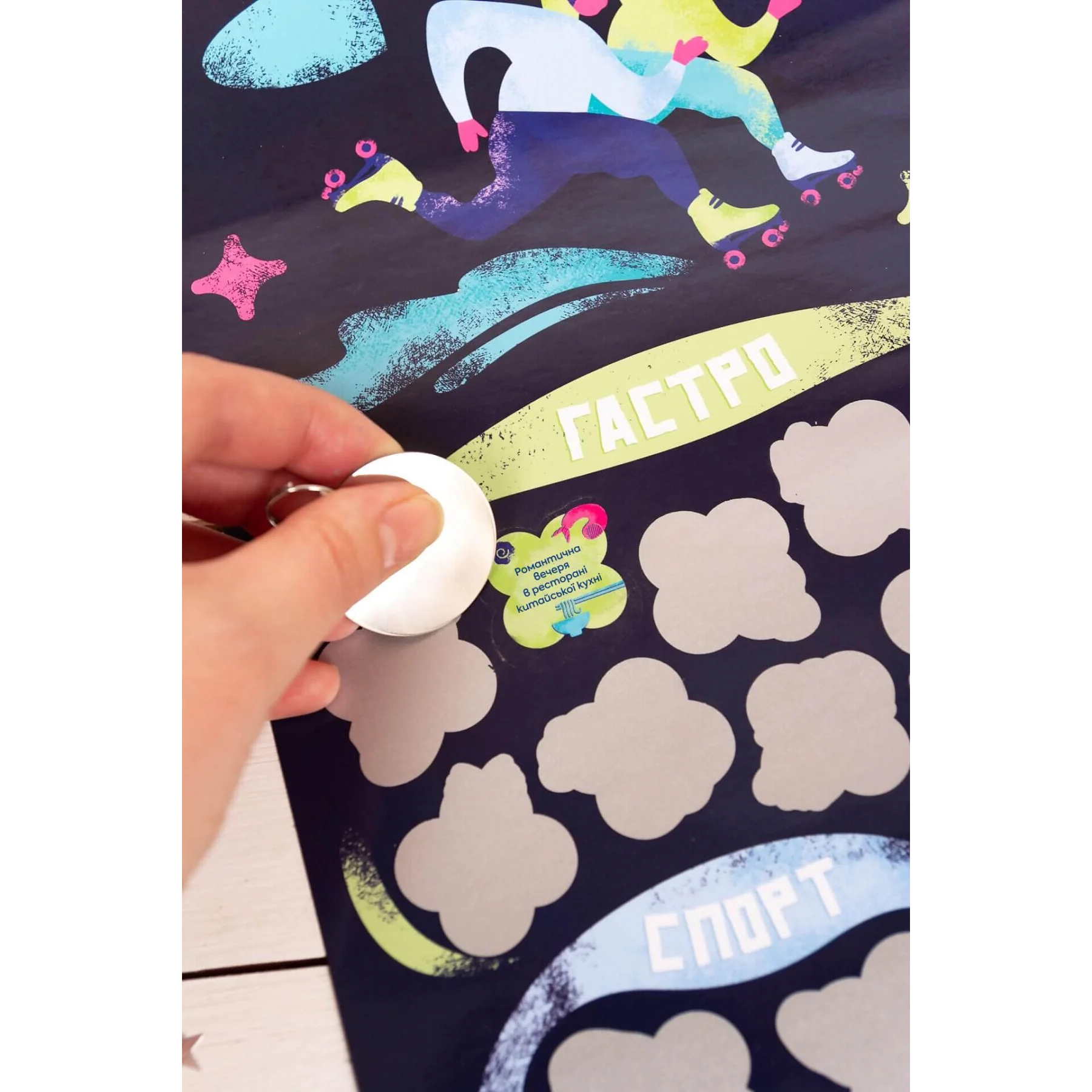 Опис: Якщо ви шукали спосіб доповнити або прикрасити свої стосунки, ви його знайшли. Ми створили для вас скретч-постер побачень. Тепер вам не потрібно «сушити» голову над тим, куди піти або як порадувати свою половинку ― ми про все подбали за вас. Усі побачення поділені на кілька категорій: просто виберіть, яка з них сьогодні вам більше до вподоби, а решту вже визначить випадок. Стирайте захисне покриття та насолоджуйтесь часом, проведеним разом!