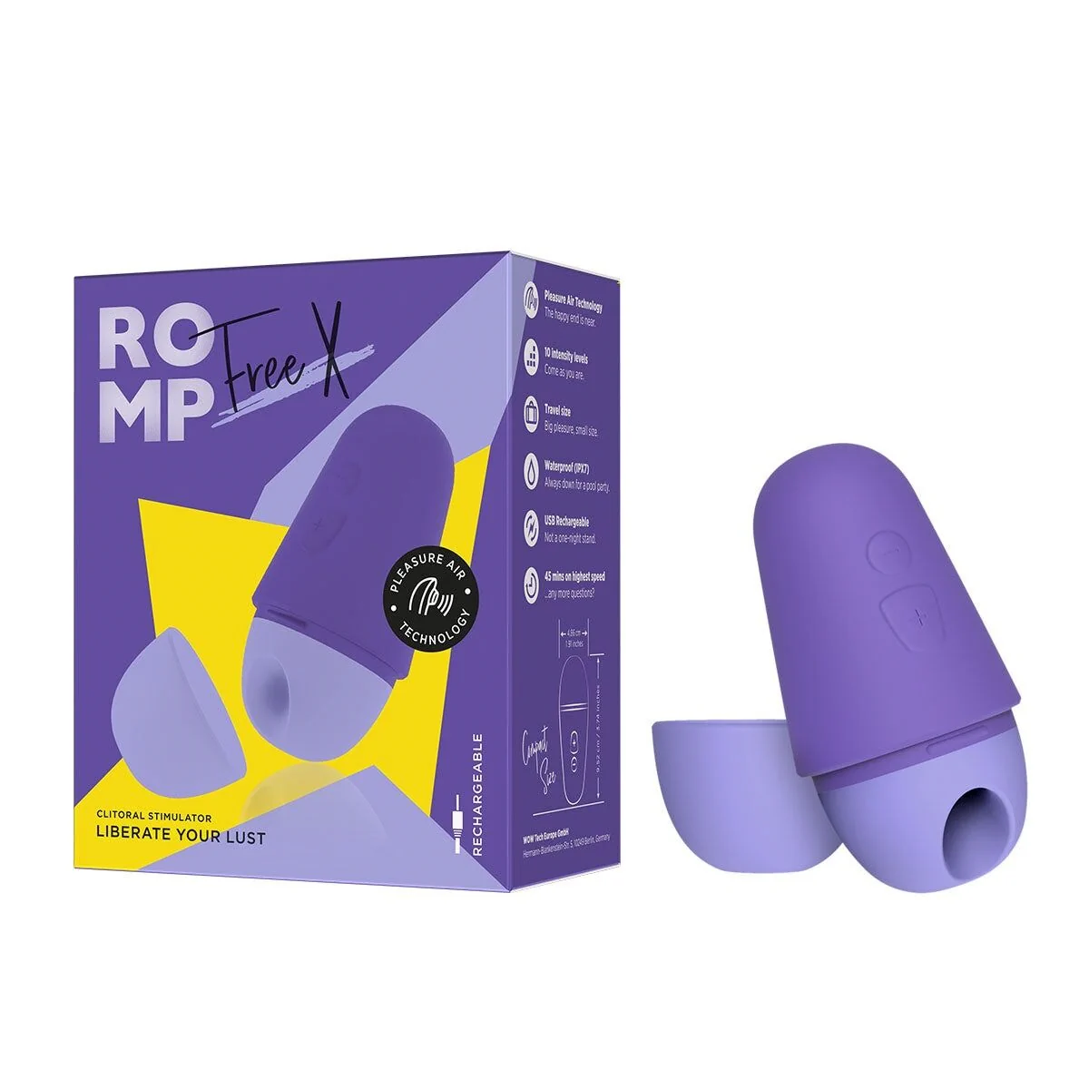 З вакуумним кліторальним стимулятором Romp Free задоволення завжди у вашій сумочці! Цей девайс від бренду Romp дуже мініатюрний (всього 10,2 × 5,4 × 3,8 см) та має захисний дорожній ковпачок, що робить іграшку вашим ідеальним супутником у всіх щоденних справах та подорожах. Кліторальний вібратор, оснащений технологією Pleasure Air Technology™, м’яко масажує та посмоктує ваш клітор повітряними хвилями, доводячи вас до неймовірної кульмінації за кілька хвилин. Ви можете насолоджуватися та отримувати бажану розрядку в будь-який час і в будь-якому місці — стимулятор дуже тихий і не розкриє вашу маленьку таємницю. Усе це, на додаток до 10 рівнів інтенсивності та 100 % водозахисту IPX7 робить вакуумний кліторальний стимулятор Romp Free вашим ідеальним коханцем.