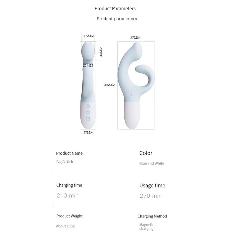 Абсолютно точне влучення! Пропонуємо купити вібратор-кролик для точки G KISSTOY Big G — саме він змусить вас тремтіти від задоволення та стогнати від подвійних оргазмів. Адже він ідеально потрапляє на точку G і клітор, якими б у вас не були анатомічні особливості. Потужний мотор створює вібрації, які відчуваються і в стовбурі, й у відростку (5 режимів), і для кожного режиму можна регулювати інтенсивність (5 рівнів) — цілих 25 комбінацій для задоволення! Під час ввімкнення іграшки стовбур автоматично підігрівається до комфортної температури для ідеальних відчуттів під час введення. Вібратор повністю водонепроникний.