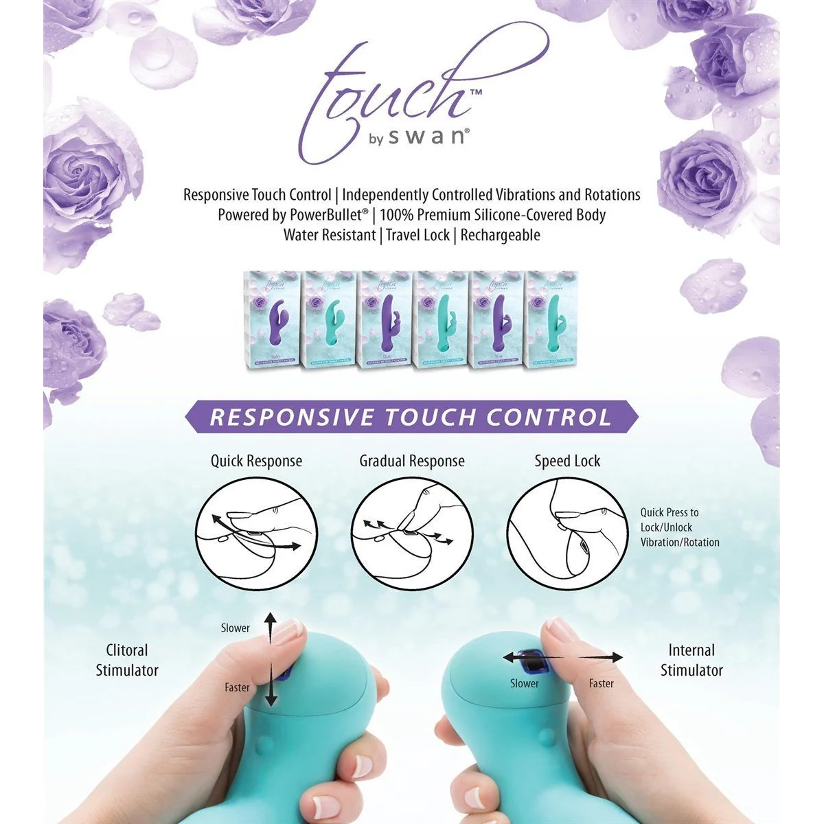Люксовая колекція вібраторів Touch by Swan – це 35 років досвіду в розробці секс-іграшок, надійна технологія вібрації PowerBullet®, розкішна форма і інтуїтивне управління.