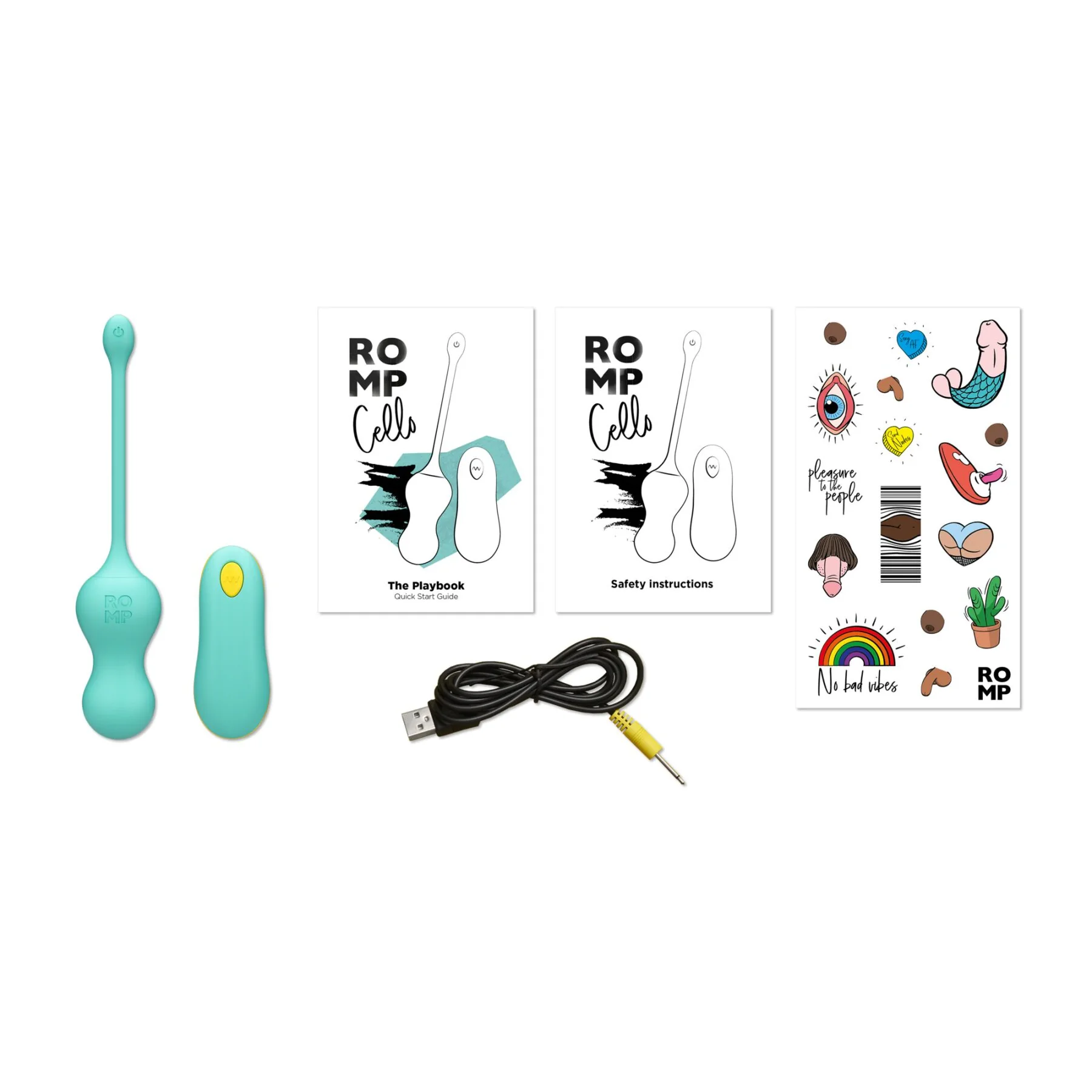 Комплектація: віброяйце для точки G Romp Cello, USB-кабель для заряджання, пульт ДК, батарейка в комплекті, короткий посібник та інструкції з безпеки.