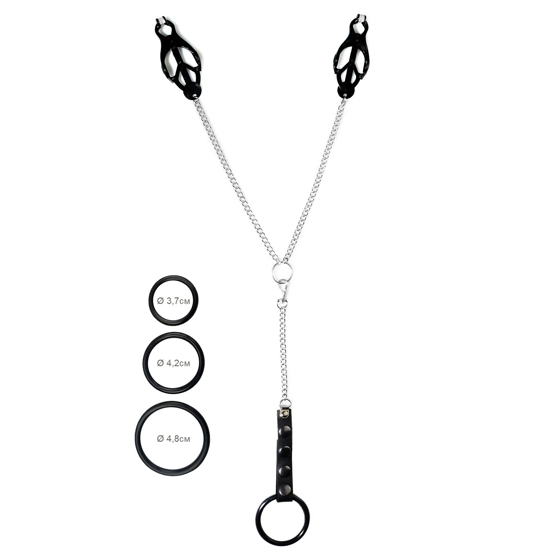 Затискачі з'єднані з ерекційним кільцем за допомогою довгого металевого ланцюжка. Він призначений не тільки для зручності, а й може стати вашим помічником під час інтимних практик. На кінці ланцюжка є застібка з натуральної шкіри, до якої і кріпиться ерекційне кільце. Ви можете змінювати кільця, залежно від діаметра пеніса або підбираючи найбільш підходяще кільце, виходячи з особистих сексуальних переваг.