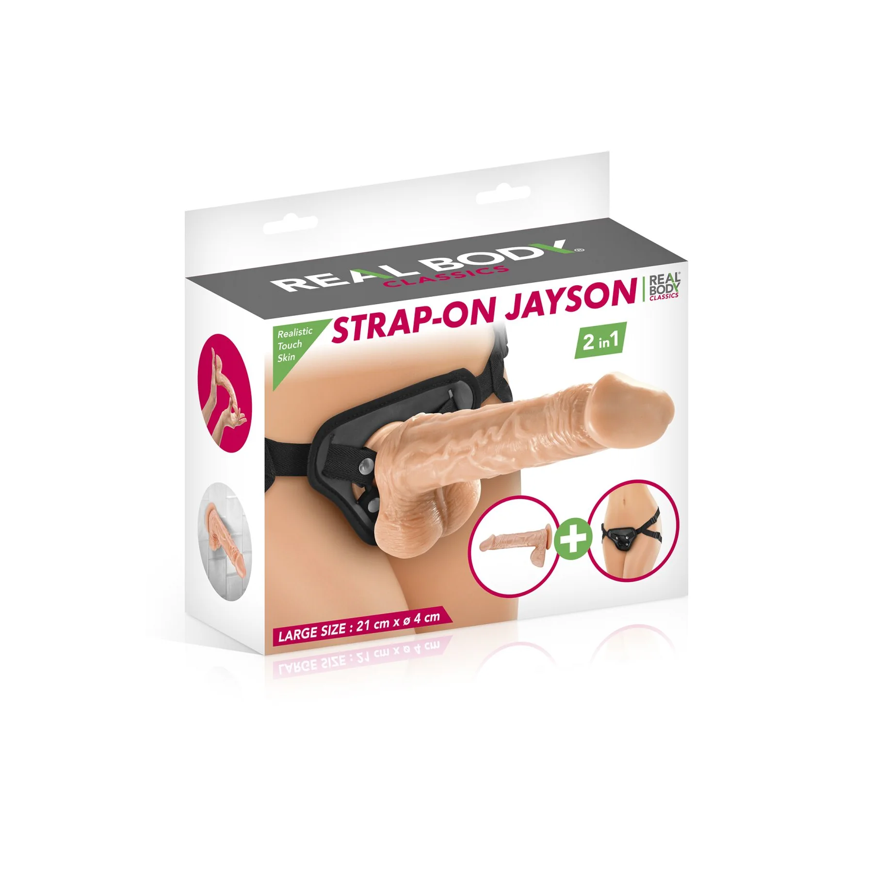 Жіночий страпон-трусики 2в1 Real Body — Jayson — це секс-іграшка високої якості, яка допоможе здійснити багатьом парам найнеймовірніші еротичні фантазії. Ніжний, гнучкий, з великою головкою та яєчками, цей фалос подарує вам інтенсивну стимуляцію та численні оргазми, під час вагінального та анального сексу, з поясом та без. Потужна присоска в основі фалосу дає змогу використовувати його без рук, просто прикріпивши до гладкої поверхні столу або на кахлі у ванній. Все залежить тільки від вашої фантазії, бажання і рівня збудження. Підходить для тих, хто хоче поринути у світ БДСМ чи пеггінгу, для одностатевих та гетеросексуальних пар. Матеріал штучного фалосу повністю гіпоалергенний, не пористий, без запаху та не містить фталатів. Діаметр фалосу 4 см, тому для новачків в анальному сексі його треба використовувати акуратно та з великою кількістю лубриканта. Трусики зручно регулюються за розміром завдяки двом ременям, не натирають, не заважають і надійно триматися на стегнах навіть під час найінтенсивніших рухів.